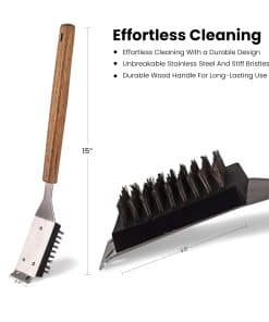 El Cepillo para Parrilla DHAMPOOH es el complemento perfecto para mantener tu parrilla impecable y lista para usarse en cualquier momento. Con cerdas de acero inoxidable reemplazables, podrás eliminar la grasa y la suciedad más difíciles sin esfuerzo. Su diseño de cerdas que no rayan protege la superficie de tu parrilla, preservando su calidad y durabilidad. El mango de madera extendido de 15� garantiza un fácil alcance en áreas amplias, mientras que su construcción ligera pero resistente proporciona un agarre cómodo y seguro. Este cepillo para parrilla aporta un rendimiento pesado, capaz de abordar incluso los residuos más horneados con facilidad, lo que lo convierte en una herramienta indispensable para todo amante de la parrilla. Además, su fácil montaje y mantenimiento lo hacen ideal para su uso regular. Mantén tus utensilios de parrilla organizados y listos para la próxima reunión al aire libre con el Cepillo para Parrilla DHAMPOOH.