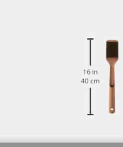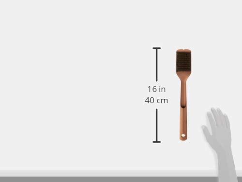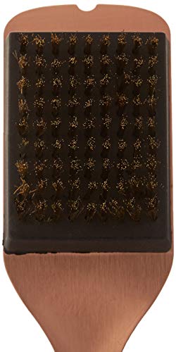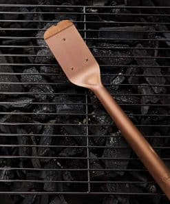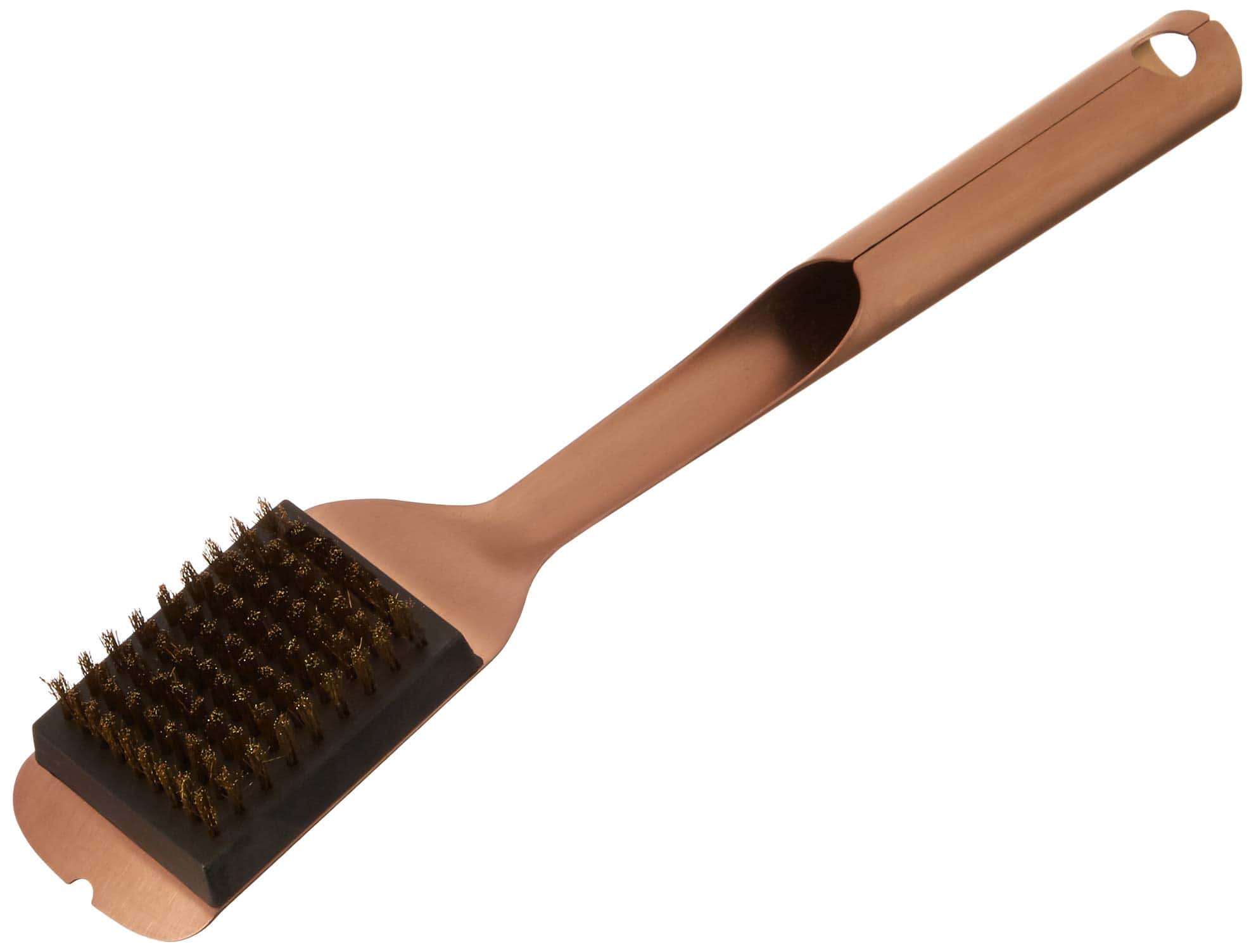 Este cepillo para parrilla es un brillante ejemplo de diseño elegante y duradero. Su resistente acero inoxidable recubierto de titanio color cobre y su forma estilizada reflejan la belleza de la simplicidad enfocada. Las cerdas de latón son seguras en todas las superficies de rejilla de la parrilla, y toda la herramienta es completamente resistente a la intemperie. Sin campanas ni silbatos, solo estilo puro y utilidad pura.