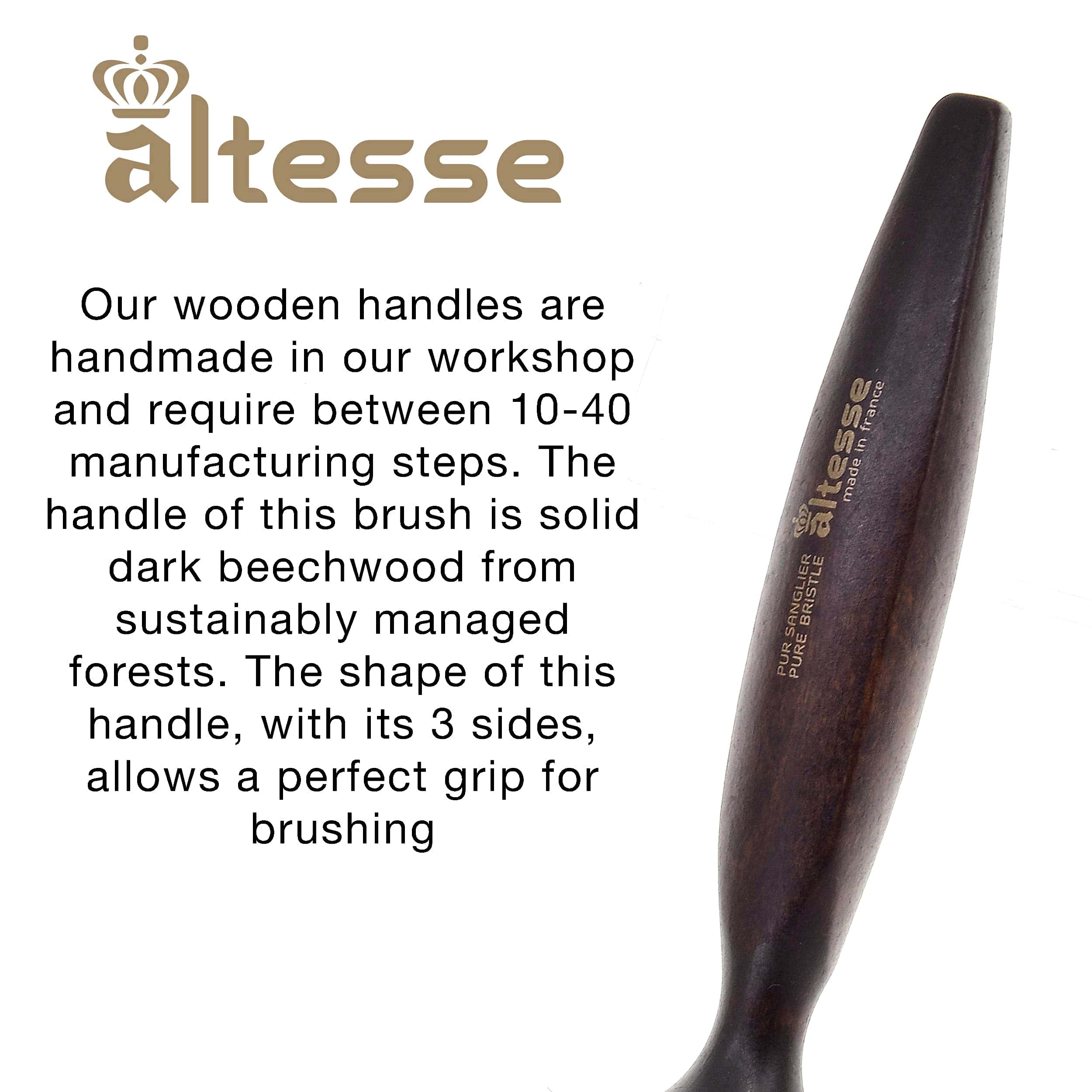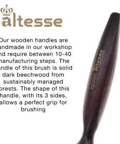 Nuestros mangos de madera están hechos a mano en nuestro taller y requieren entre 10 y 40 pasos de fabricación. El mango de este cepillo es de madera de haya oscura sólida de bosques manejados de forma sostenible. La forma de este mango, con sus 3 lados, permite un agarre perfecto para el cepillado. Maison Fournival Altesse ha perfeccionado el arte de la fabricación de cepillos en Francia desde 1875. La experiencia y los criterios más estrictos de excelencia se aplican al diseño y la creación de cada cepillo. Ahora fabricamos productos únicos para los grandes nombres de la belleza. Nuestra experiencia en la fabricación de cepillos ha obtenido un reconocimiento oficial del gobierno francés, con el título de Empresa del Patrimonio Viviente por su excelencia en la artesanía tradicional. Nuestros productos se fabrican en el Oise, una región conocida como la cuna de la fabricación de cepillos francesa.