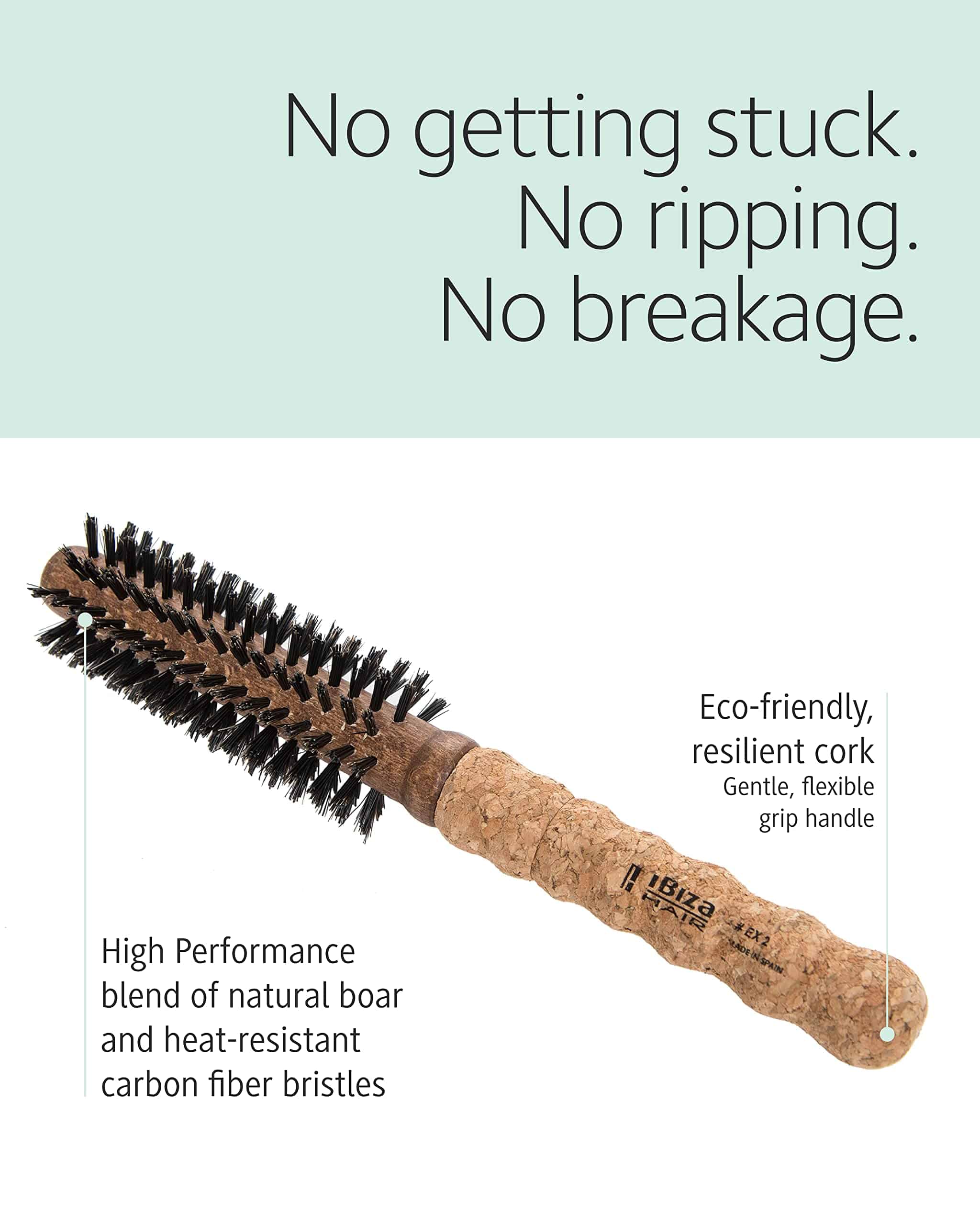 Cepillo redondo de cerdas de jabalí Ibiza Hair EX2-40mm con mango de corcho extendido. Este cepillo está disponible en 5 tamaños y es el diseño más innovador en ergonomía en un cepillo redondo. Es ligero y fácil de manejar, con cerdas de jabalí reforzadas extra densas perfectas para el estilismo de alto rendimiento. Ideal para peinar flequillos, líneas del cabello, líneas del cuello y añadir textura y brillo a estilos cortos a medianos.