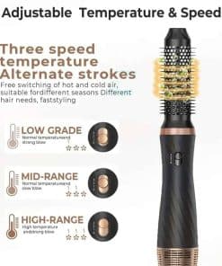 3. 3 AJUSTES DE TEMPERATURA: El cepillo secador de pelo ofrece 3 ajustes de temperatura para regular el calor. El estilizador de cepillo caliente es adecuado para diferentes tipos de cabello. Temperatura alta: para peinados rápidos, adecuado para cabello grueso y presecado. Temperatura media: para tu peinado fijado y duradero. Temperatura baja: para cabello fino, dañado y procesado. El cepillo secador de pelo puede secar eficazmente el cabello sin dañarlo, y tiene la flexibilidad para fijar una variedad de estilos que desees. Elige la mejor temperatura para tu cabello.
