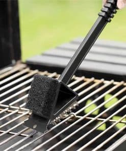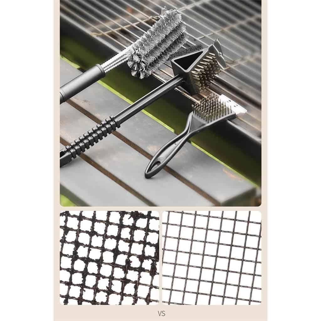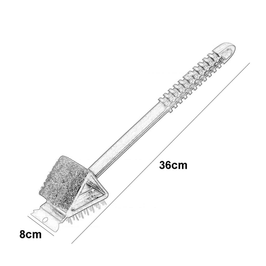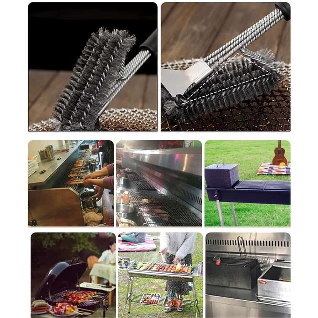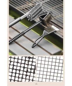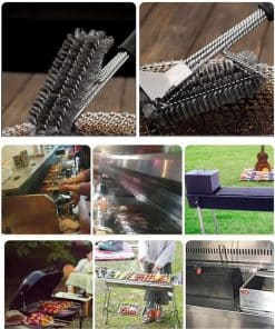 ¿Alguna vez has deseado que hubiera una forma más fácil de limpiar tu parrilla? Características: 1. Rascador resistente – quita rápidamente los restos más persistentes con facilidad. 2. Cabeza cuadrada con cerdas de acero inoxidable más gruesas: puede cubrir y limpiar fácilmente un área más grande a la vez. 3. Con diseño de cuello angular entre la cabeza del cepillo y el mango – te proporciona el ángulo más cómodo de uso, nunca te sentirás incómodo al aplicar presión mientras intentas mantener la cabeza del cepillo plana en la superficie de la parrilla (como sueles hacer). 4. Mango largo – protege tus manos del calor y te da un control total. Consejo útil: Recomendaciones en la barbacoa después de usar, por seguridad y salud, sin importar qué tipo de cepillo de barbacoa uses, por favor usa un paño húmedo para limpiar la parrilla, para asegurarte de que la parrilla esté sin polvo ni cerdas.
