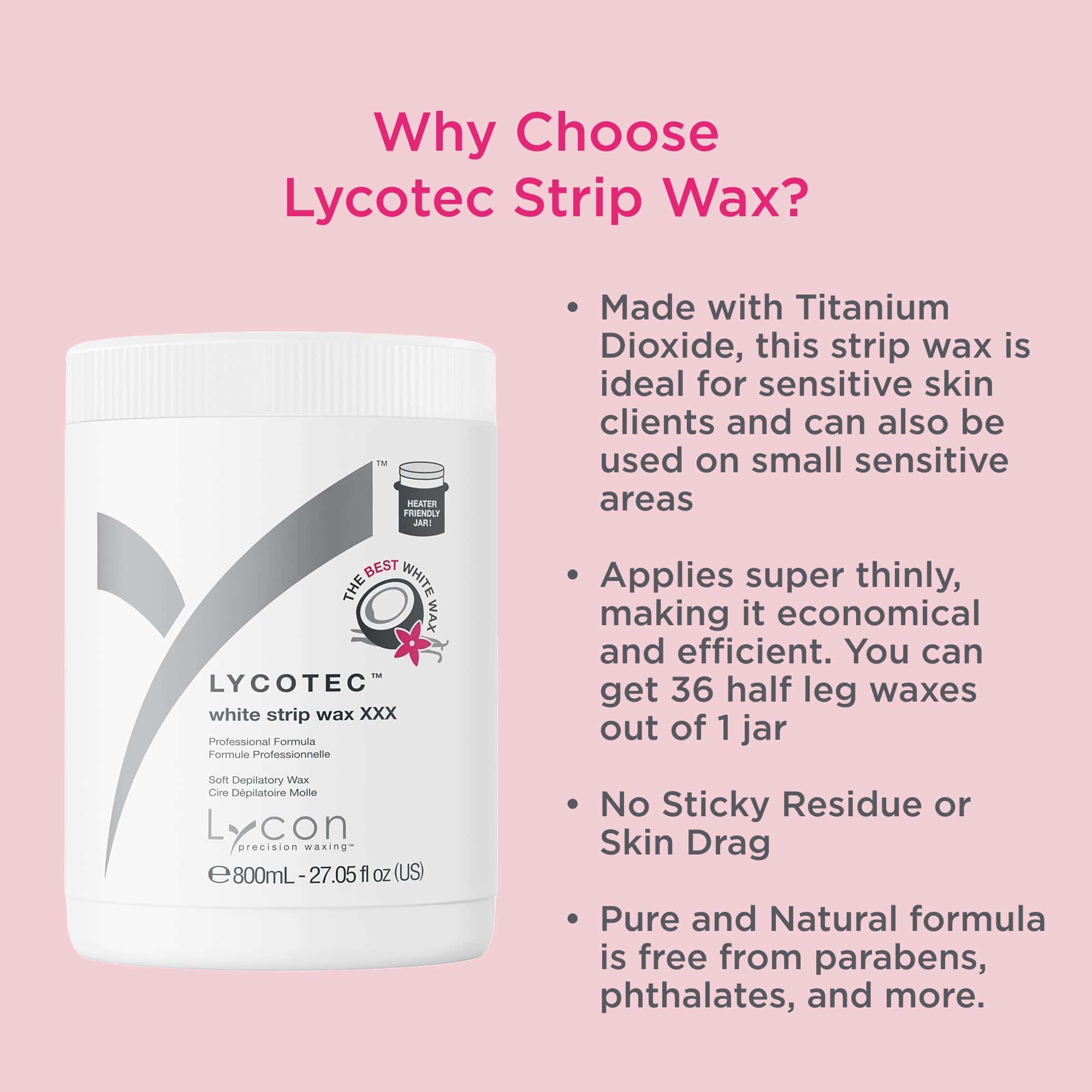 Lycon Lycotec White Strip Wax es una cera suave diseñada para una depilación rápida y eficiente en áreas más grandes. Su fórmula de alta tecnología con textura cremosa y suave garantiza una eficiencia precisa, lo que la convierte en una cera esencial para cualquier entorno profesional. Con ingredientes de calidad como el aceite de coco, dióxido de titanio y micro mica, esta cera también cuenta con un toque de vainilla que reconforta la piel sensible durante el proceso de depilación. La cera está formulada sin gluten, parabenos y ftalatos, siendo una opción segura y efectiva para todo tipo de piel. Ofreciendo una aplicación suave y eficiente, esta cera para pieles sensibles es perfecta para áreas grandes como las piernas, brazos, pecho y espalda. Fabricada en Australia, esta cera de calidad profesional garantiza resultados excepcionales para satisfacer las necesidades de tu clientela de salón.