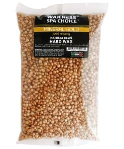 Waxness Mineral Gold es una cera depilatoria superior híbrida polimérica flexible, demi-cremosa, muy versátil y económica, adecuada para depiladoras de alto volumen. Esta cera demi cremosa es la elección perfecta para uso en todas las áreas, teniendo el equilibrio perfecto entre cremosa y translúcida. Instrucciones: Derrita la cera a fuego lento. Pruebe la temperatura correcta. ADVERTENCIA: La cera caliente puede causar quemaduras en la piel. Asegúrese de que la piel esté limpia. Prepare la piel con polvo o loción si es necesario. La cera estará lista para remover una vez que ya no esté pegajosa al tacto. Tire de la tira de cera rápidamente, manteniendo la piel tensa. Tire de la tira de cera enérgicamente, contra el crecimiento del vello, cerca y paralelo a la piel. Aplique loción una vez que el tratamiento esté completo. Ingredientes: Rosinato de glicerilo, Rosinato de trietilenglicol, Cera microcristalina hidrogenada, Copolímero de etileno/acetato de vinilo, Parafina, Cera alba (Cera de abejas), Mica, Óxido de estaño, Parafinum Liquidum (Aceite mineral), CI 77891 (Dióxido de titanio), CI 77491 (Óxido de hierro rojo), CI 47000 (D&C Amarillo N. ° 11), CI 15850 (Lago rojo 6). NOTA: Este es un producto pre-derretido. Usualmente lo recibirá en forma de gránulos, pero ocasionalmente puede recibirlo en trozos, una mezcla de trozos y perlas, pedazos más grandes o ladrillos. Esto no afectará la calidad del producto que se puede usar normalmente.