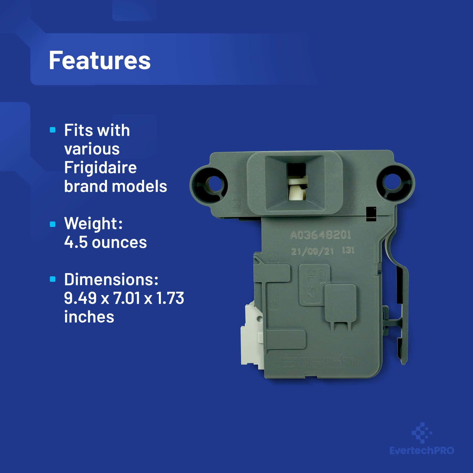 EvertechPRO Washer Replacement Door Lock Assembly Part Number 5304505231 reemplaza AP6029853. Este producto no es un producto OEM de Frigidaire. Compatible con lavadora Frigidaire. Compatible con EFLS517SIW0-WCI EFLS517STT0-WCI EFLS617SIW0-WCI EFLW317TIW0-WCI EFLW417SIW0-WCI EFLW317TIW1-WCI EFLS617STT0-WCI. El uso de los nombres comerciales y logotipos de los fabricantes son marcas registradas de sus respectivos propietarios. Cualquier uso del nombre de la marca, números de parte o designación de modelos del fabricante para este producto se hace únicamente con fines de demostración e identificación de compatibilidad y se muestra únicamente con fines descriptivos. Su uso no se asocia, implica ninguna afiliación o respaldo por parte de ningún fabricante.