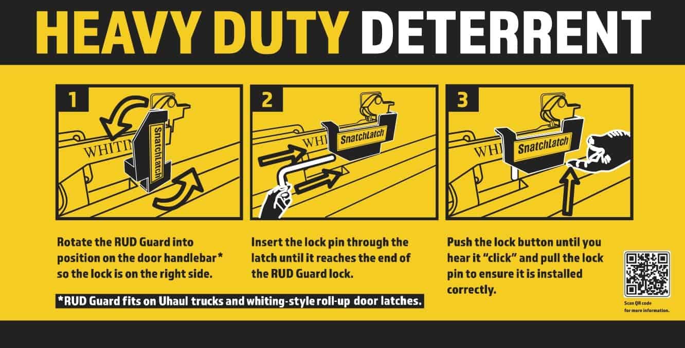Protege tus valiosos contenidos del robo con este pesado Guardia y Candado de puerta enrollable hecho para los pestillos de la marca Whiting. Ten en cuenta que este dispositivo no funcionará con el pestillo de la marca Todco. Hecho de acero de calibre grueso resistente, el guardia SnatchLatch RUD-W evitará que los ladrones intenten un robo. Este guardia asegura la manija de bloqueo para remolques de carga, camiones de caja y remolques de furgoneta seca equipados con cierres de puerta de marca Whiting.