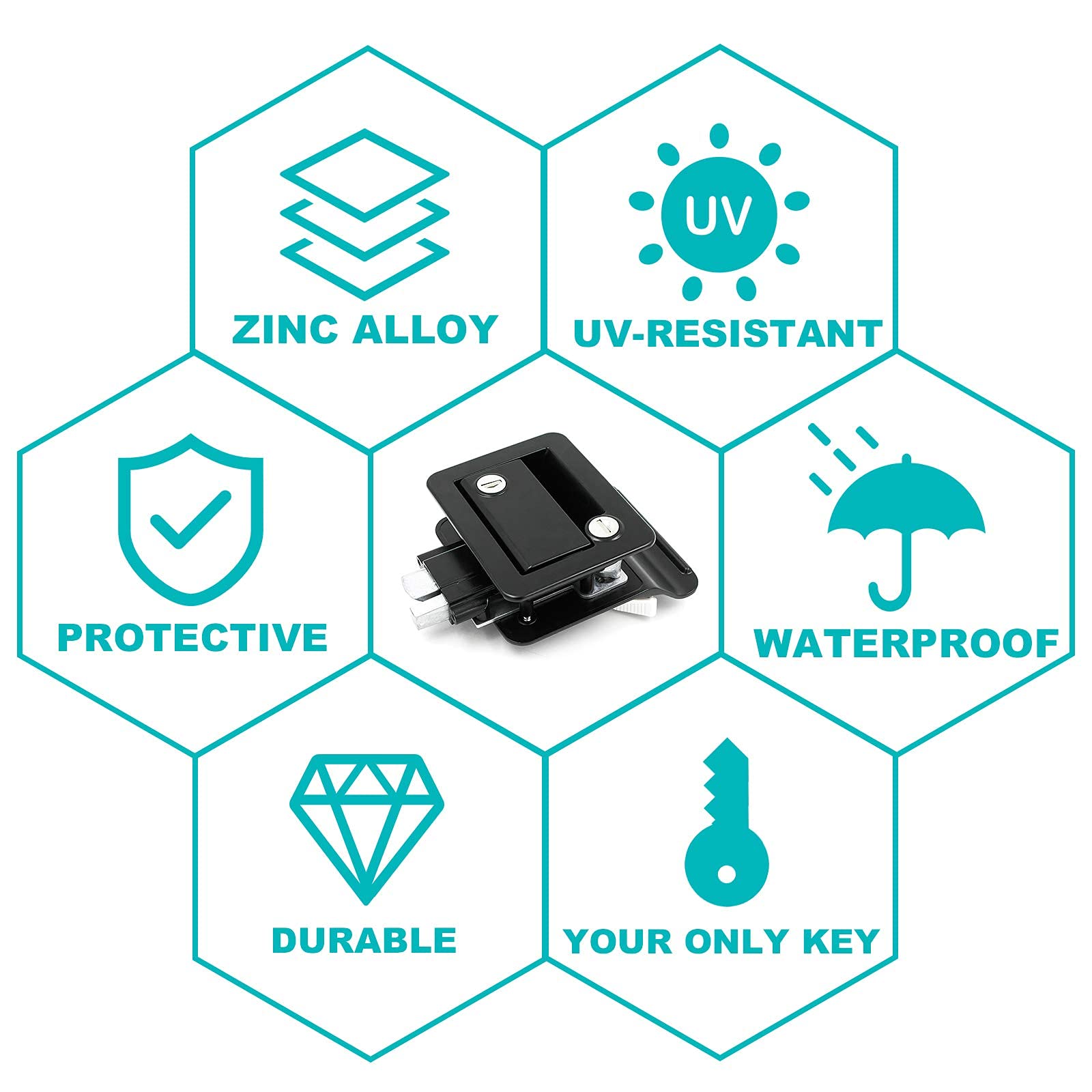 1. SE ADAPTA A LA MAYORÍA DE LOS CAMPERS Reemplaza la mayoría de las cerraduras populares con una apertura de 3.75″ x 2.75″ x 1.5″. 2. RESISTENTE Material de aleación de zinc de calidad seleccionada es más resistente que la aleación de aluminio, resistente a la corrosión, tratamiento de oxidación y resistencia al desgaste, para uso en exteriores a largo plazo. La superficie resistente a los rayos UV mantiene la cerradura de perder color. 3. PROTECTOR Montaje interior y exterior, con cerrojo incorporado que protege mejor sus bienes contra robos y le permite viajar sin preocupaciones. 4. FÁCIL DE USAR Incluye: instrucciones, 4 llaves y 24 tornillos de diferentes longitudes para satisfacer sus diferentes necesidades, cerrojos tanto interiores como exteriores, fácil de instalar. 5. ACTUALIZACIÓN El proceso de fundición múltiple le permite resistir las inclemencias del tiempo, y el proceso de montaje mejorado lo hace más resistente, mejorando la calidad durante diez años de la empresa.