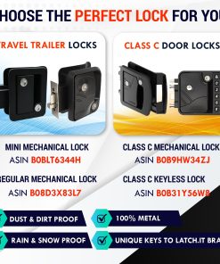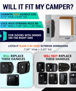 1. ¿SE AJUSTARÁ A MI APLICACIÓN Nuestros cerrojos mecánicos RV para Clase C SE AJUSTAN A LA MAYORÍA DE los camper Clase C con una ABERTURA DE CERRADURA DE 3.50″ de ancho x 4.50″ de alto x 1.5″ de espesor. ¡REVISE LAS DIMENSIONES y el ESTILO DEL CERROJO con su remolque o RV antes de comprarlo! ¡Nuestros cerrojos de RV están diseñados pensando en su seguridad!