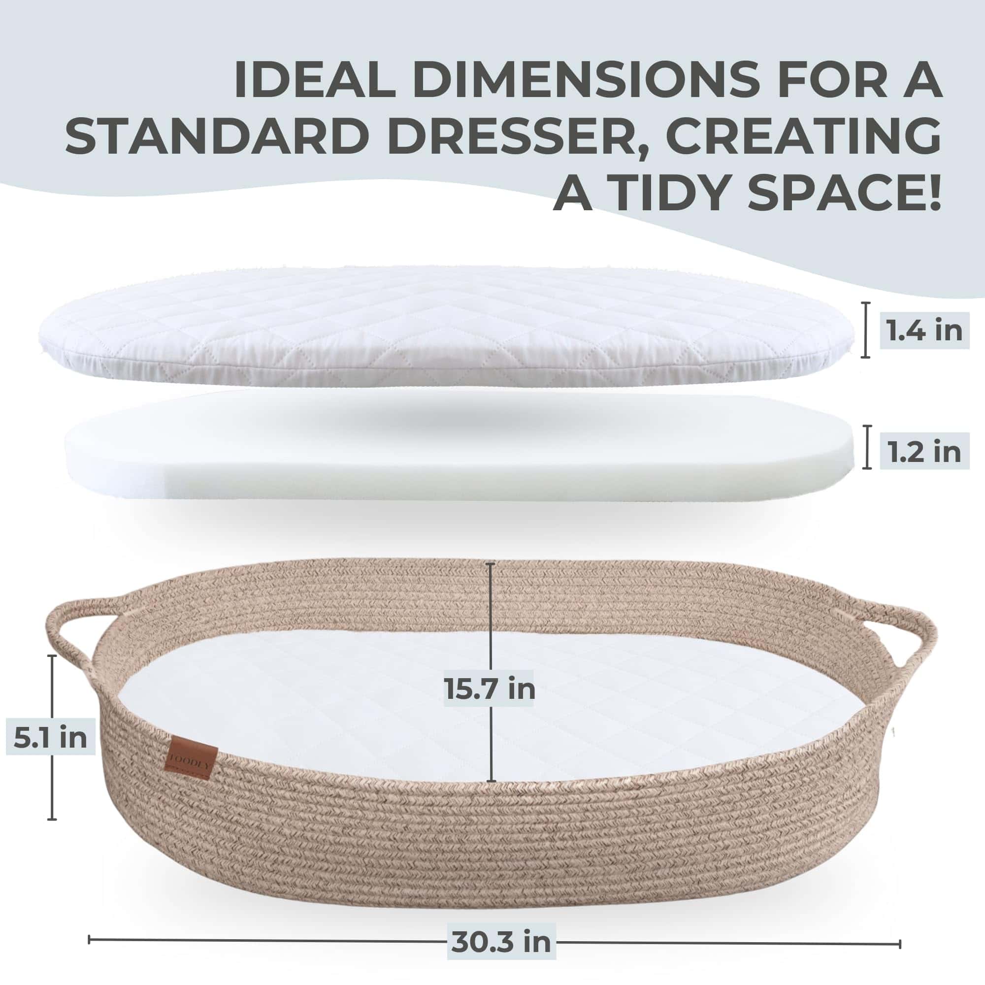 2. ESTÉTICA Y NEUTRAL EN GÉNERO: Nuestra canasta de cambio cuenta con una estética minimalista. Nuestra cesta de cambio para bebé combina perfectamente con cualquier decoración. Nuestro diseño neutral en cuanto al género hace que la tapa de mesa de cambio de Toodly sea perfecta para cualquier guardería.