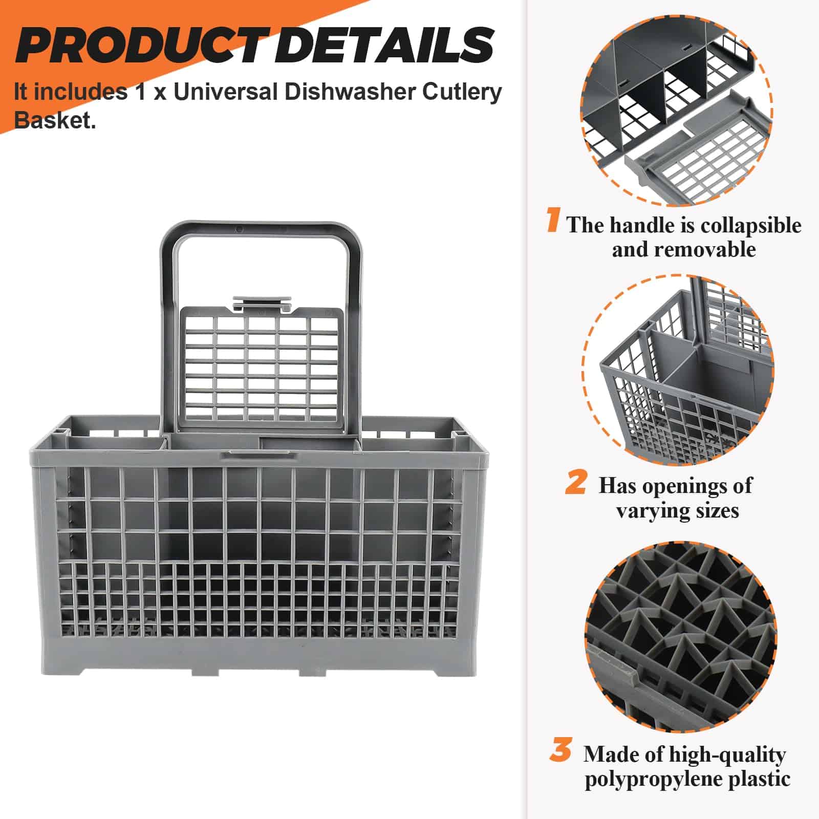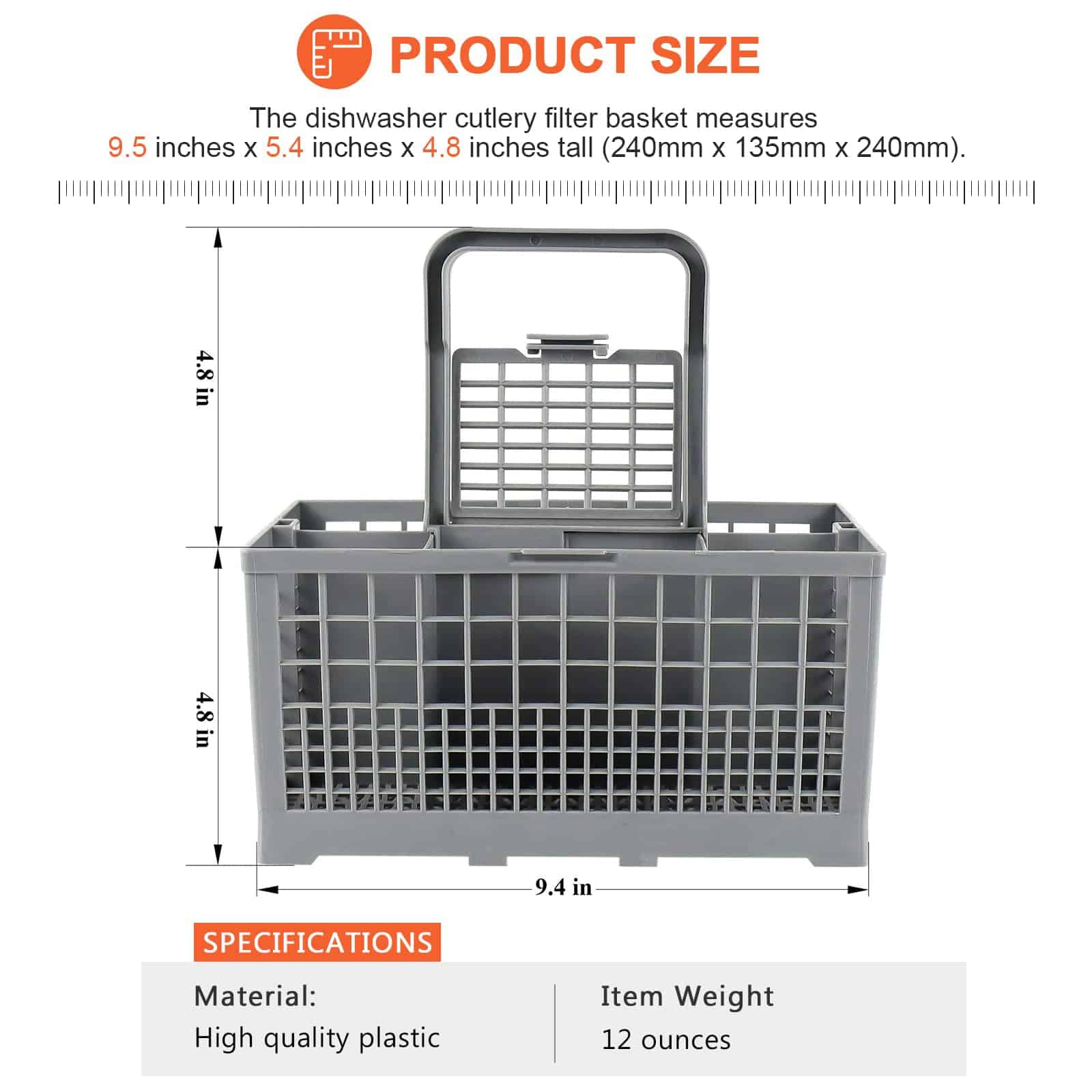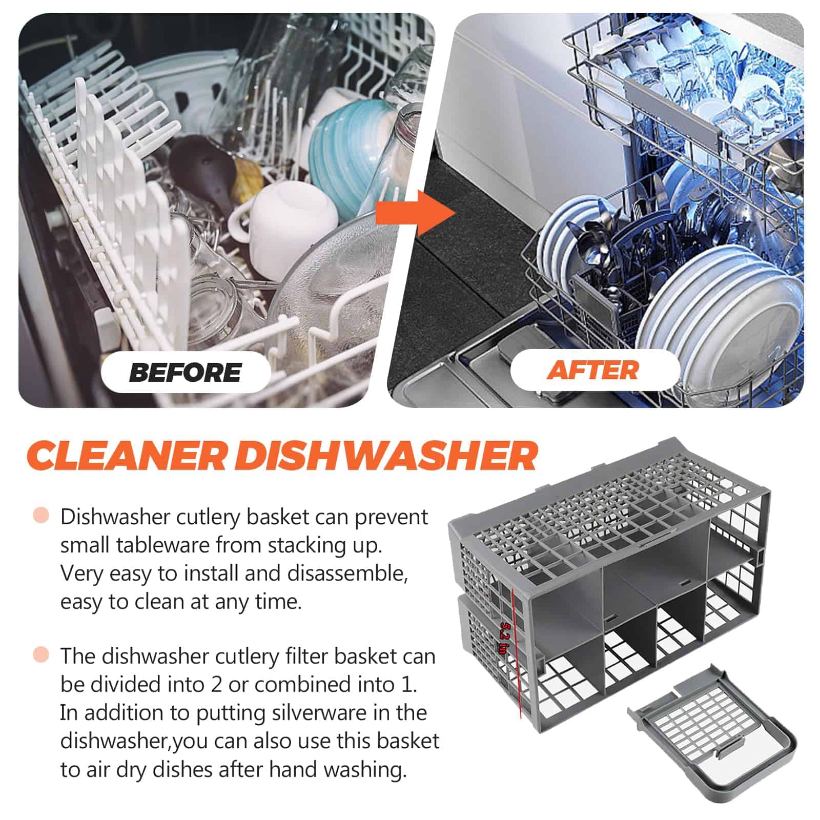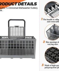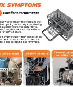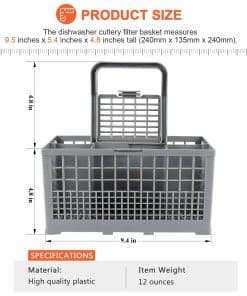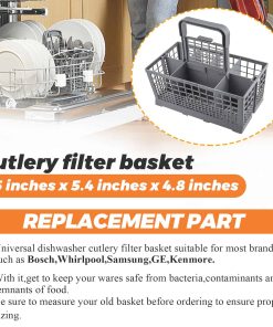 La Cesta de filtro para cubiertos de lavavajillas es fácil de usar y se adapta a casi todos los lavavajillas. Las dimensiones del producto son 9.5″ x 5.4″ x 4.8″ (Largo 240mm, Ancho 135mm, Alto con asa 240mm). El paquete incluye 1 cesta de lavavajillas dividida en 7 compartimentos + 1 asa + 1 tapa pequeña (solo para un compartimento) FÁCIL DE INSTALAR, Consejos de instalación: La cesta de cubiertos para lavavajillas adopta un diseño desmontable, muy fácil de instalar y desmontar, fácil de limpiar en cualquier momento. SOLUCIONA LOS SIGUIENTES SÍNTOMAS: Las tapas se han roto y el fondo está desgastado. FUNCIONA CON LA MAYORÍA DE LAS MARCAS: Kenmore, Whirlpool, Bosch, Samsung, GE. POR FAVOR, TEN EN CUENTA: Ten en cuenta que las piezas de electrodomésticos pueden parecer similares en muchos aspectos. Si no estás seguro de si la pieza que estás ordenando se adapta a tu modelo, por favor envíanos un correo electrónico antes de ordenar. Incluye tu número de modelo y número de serie. Podemos verificar si la pieza se ajustará a tu modelo.