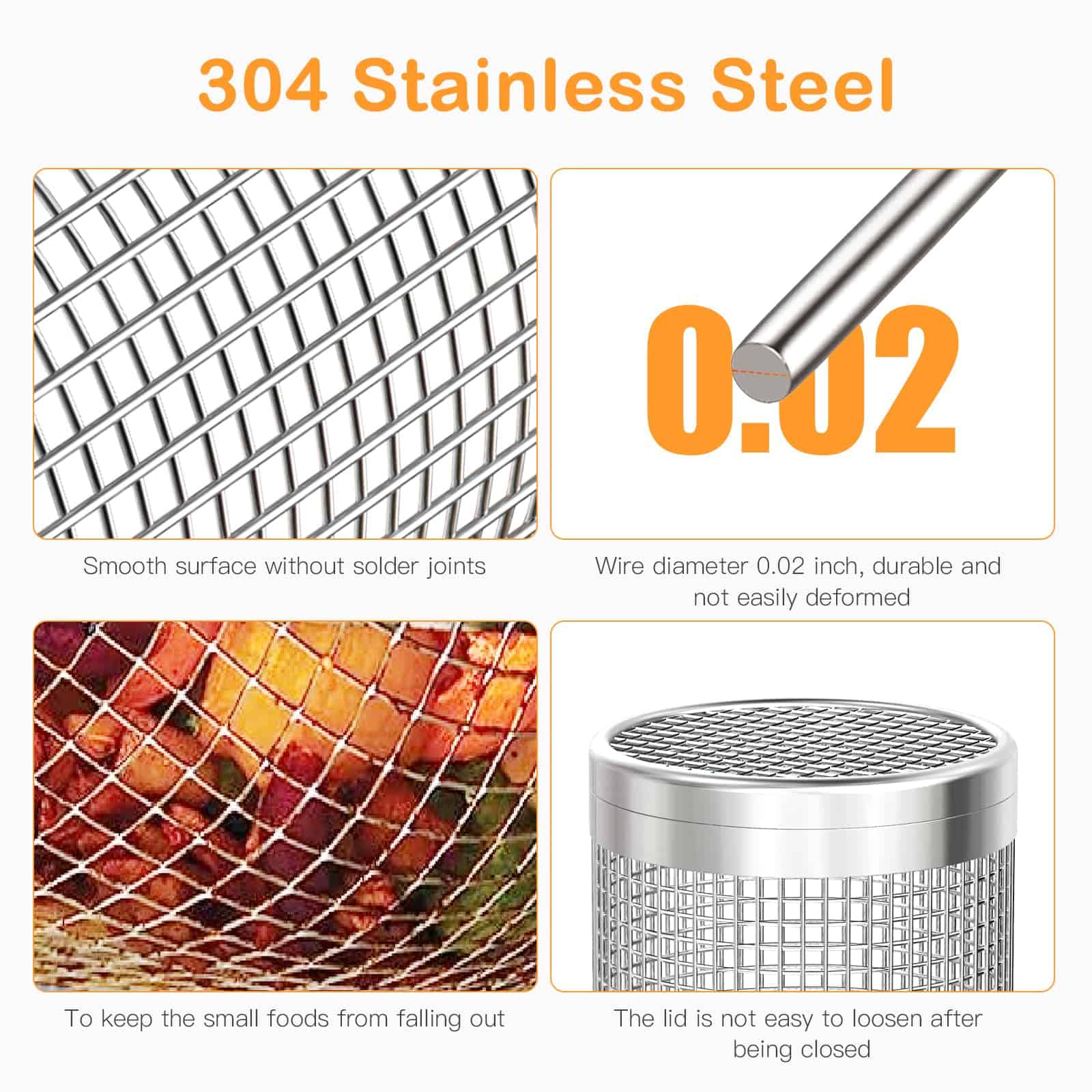 2. Malla de Acero Inoxidable: La cesta de BBQ está hecha de acero inoxidable de grado alimenticio, por lo que no tiene que preocuparse por materiales nocivos filtrándose. La malla de acero está engrosada utilizando nueva tecnología, con un diámetro de hasta 0.8 MM, proporcionando una excelente resistencia a la deformación y durabilidad para acompañar cada salida de BBQ. Puede disfrutar de su BBQ con confianza y sin preocupaciones.