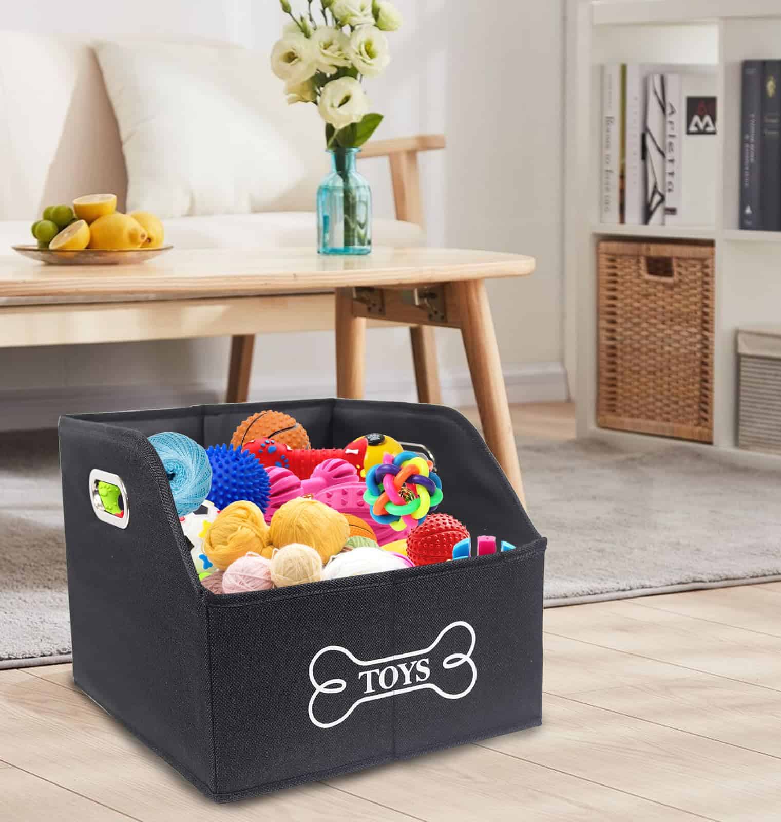 2. Resistente cesto para perros: Hecho de tela duradera y amigable para mascotas con asas de metal dobles, este cesto de juguetes para perros es ideal para almacenar juguetes de perros, artículos para mascotas, como pelotas, chillones, cuerdas, etc.