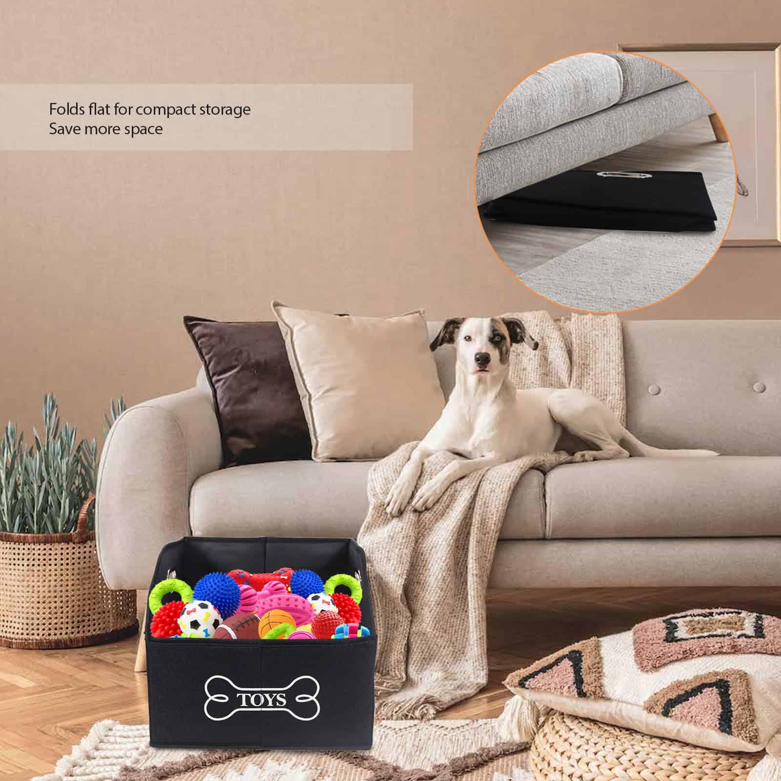 5. Tamaño de la caja de juguetes para perros: 14.9″L 13.38″W 11.41″H pulgadas. Tamaño perfecto que se puede colocar en cualquier lugar que desee. Funciona muy bien en estantes, bajo mesas de centro y en dormitorios. Fácil de plegar cuando no está en uso o cuando necesita transportarlo.