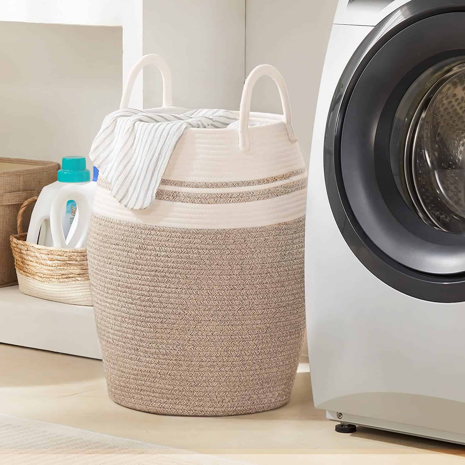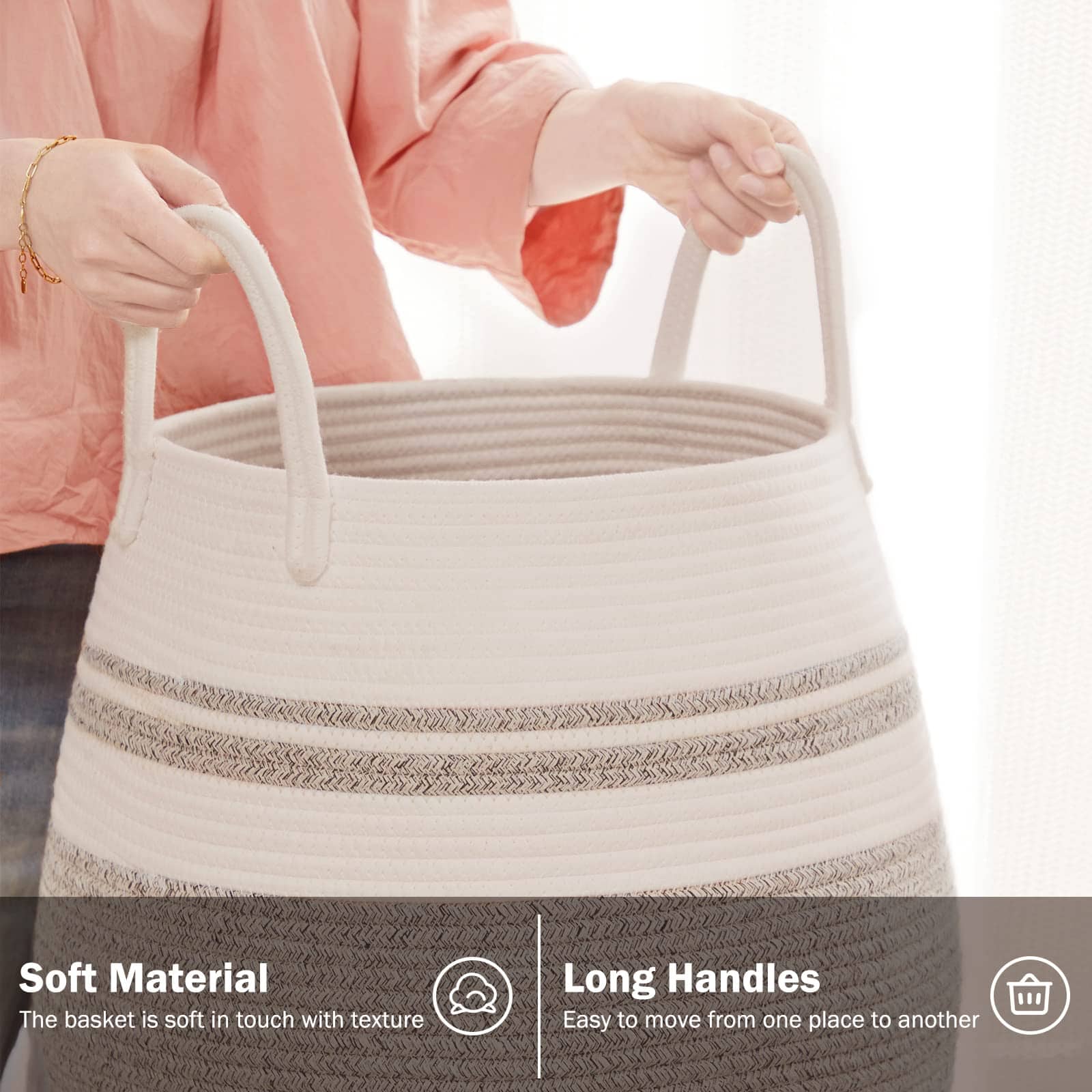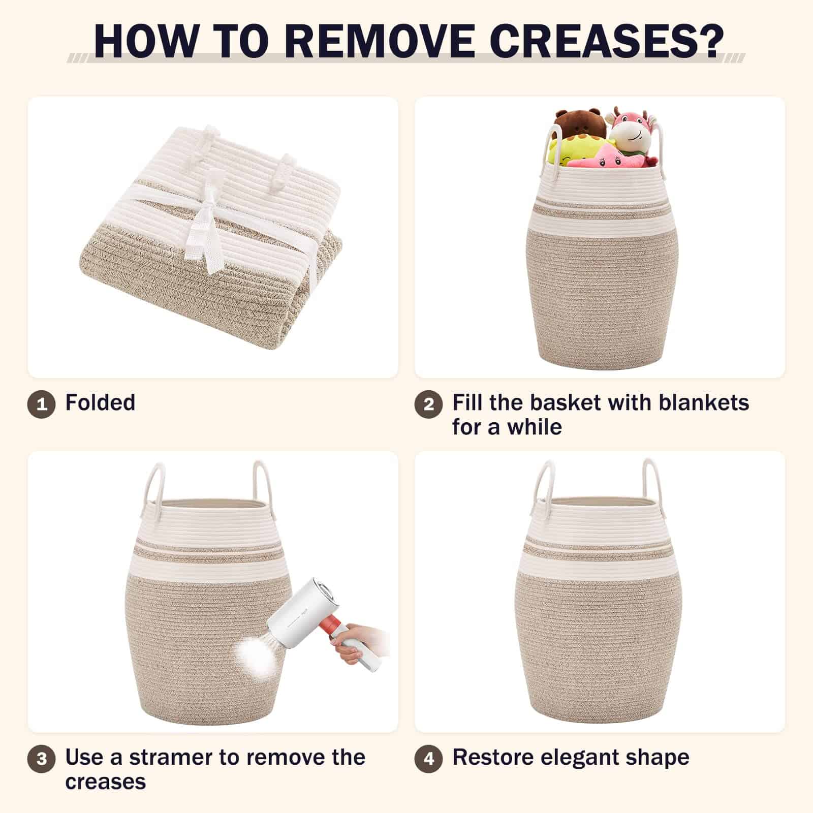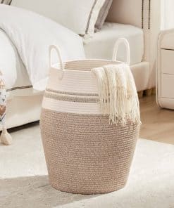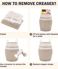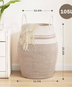 4. Cestas de almacenamiento multiusos: El cesto con capacidad de 105L puede mantener las cosas organizadas de manera elegante y decorativa. Puedes usarlos para almacenar toallas extra, mantas, ropa, juguetes para bebés y perros, libros, almohadas u otros artículos domésticos alrededor de la casa, cualquier cosa que puedas imaginar.