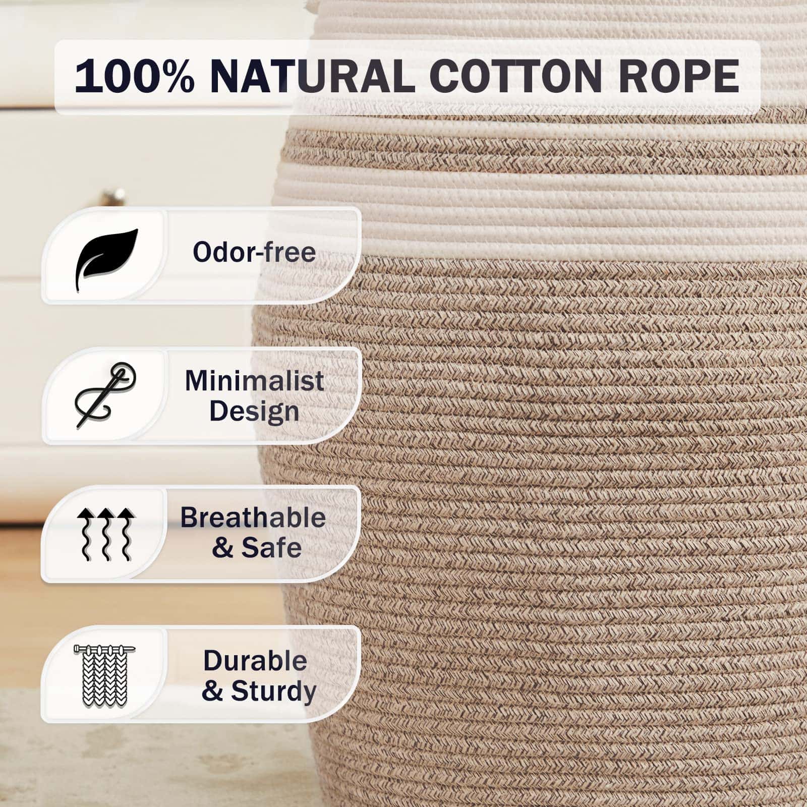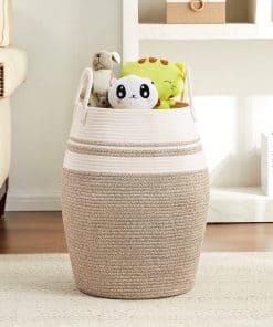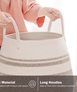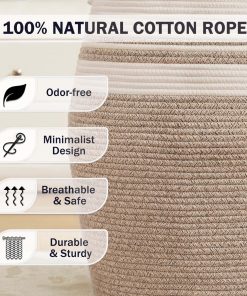 1. Cesto alto ecológico: El tamaño total del cesto de ropa es de aproximadamente 19D x 26H pulgadas, que está hecho 100% de hilo de algodón natural tejido a mano, sin plásticos, productos químicos agresivos, toxinas o aditivos dañinos. Perfecto para ropa, mantas, peluches y juguetes.