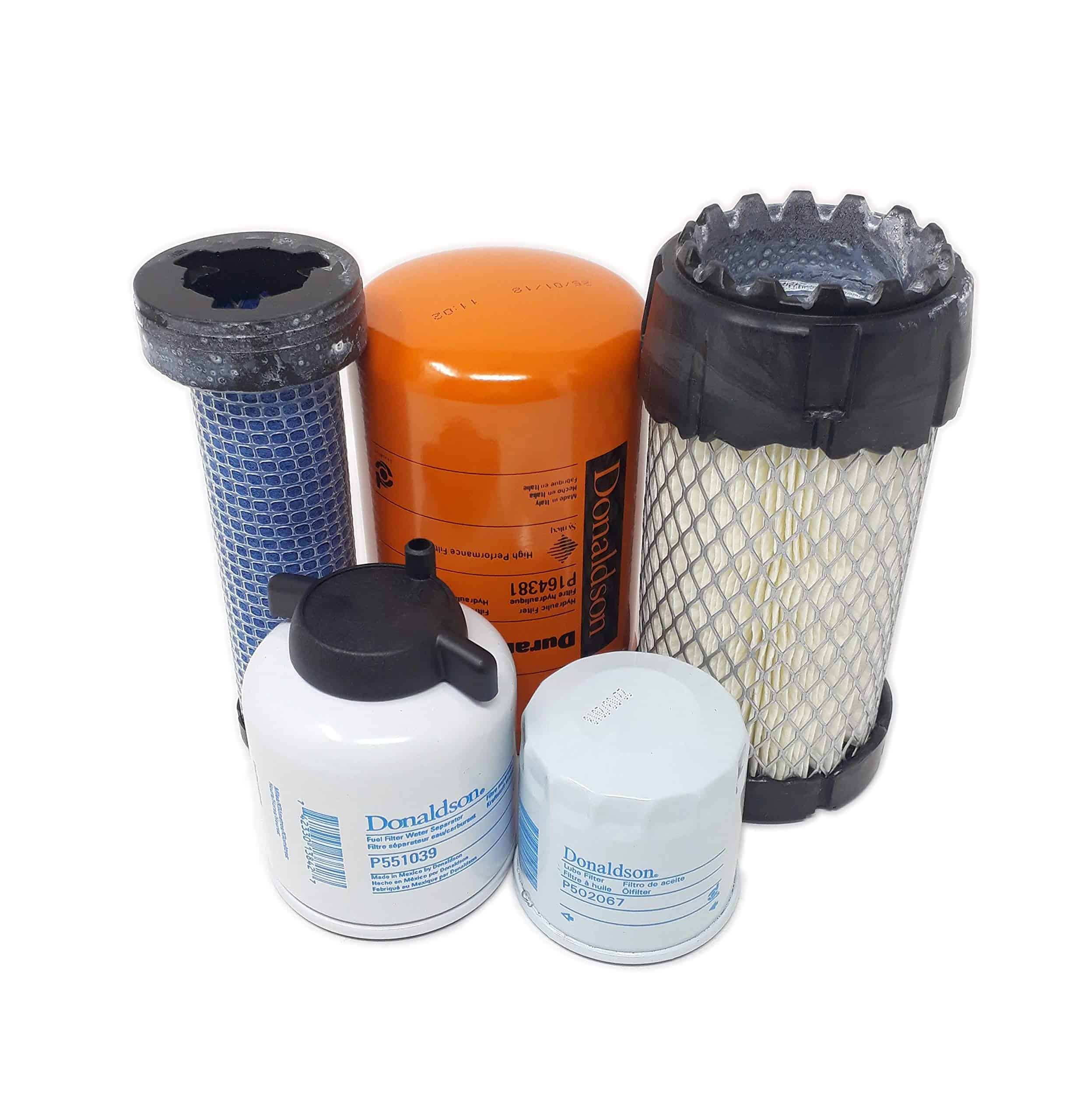 Filtros incluidos (1) Lube Reemplaza 6671057 (1) Separador de Agua de Combustible Reemplaza 6667352 (1) Aire (Externo) Reemplaza 6687262 (1) Aire (Interno) Reemplaza 6687263 (1) Hyd. Reemplaza 6677652