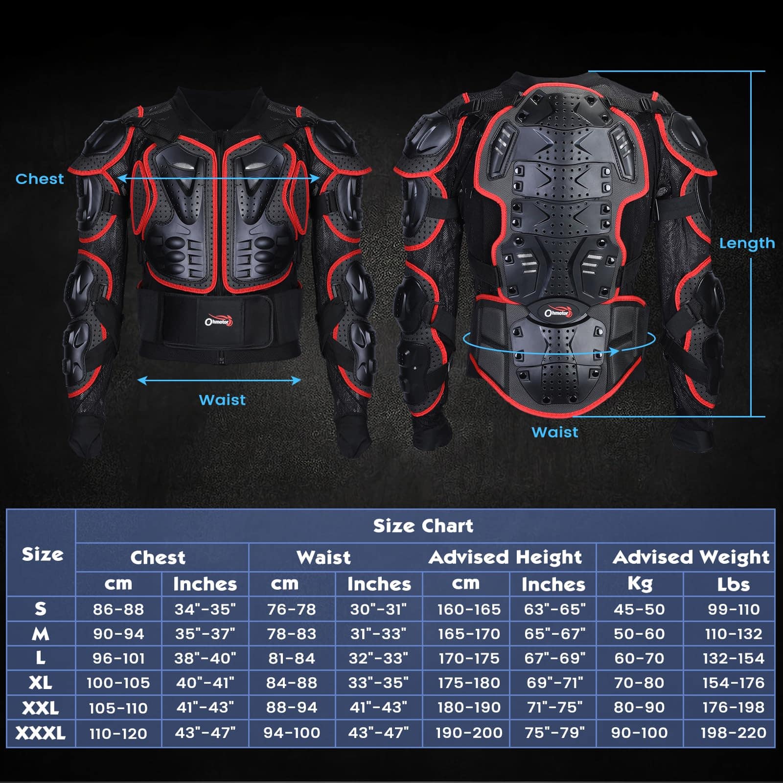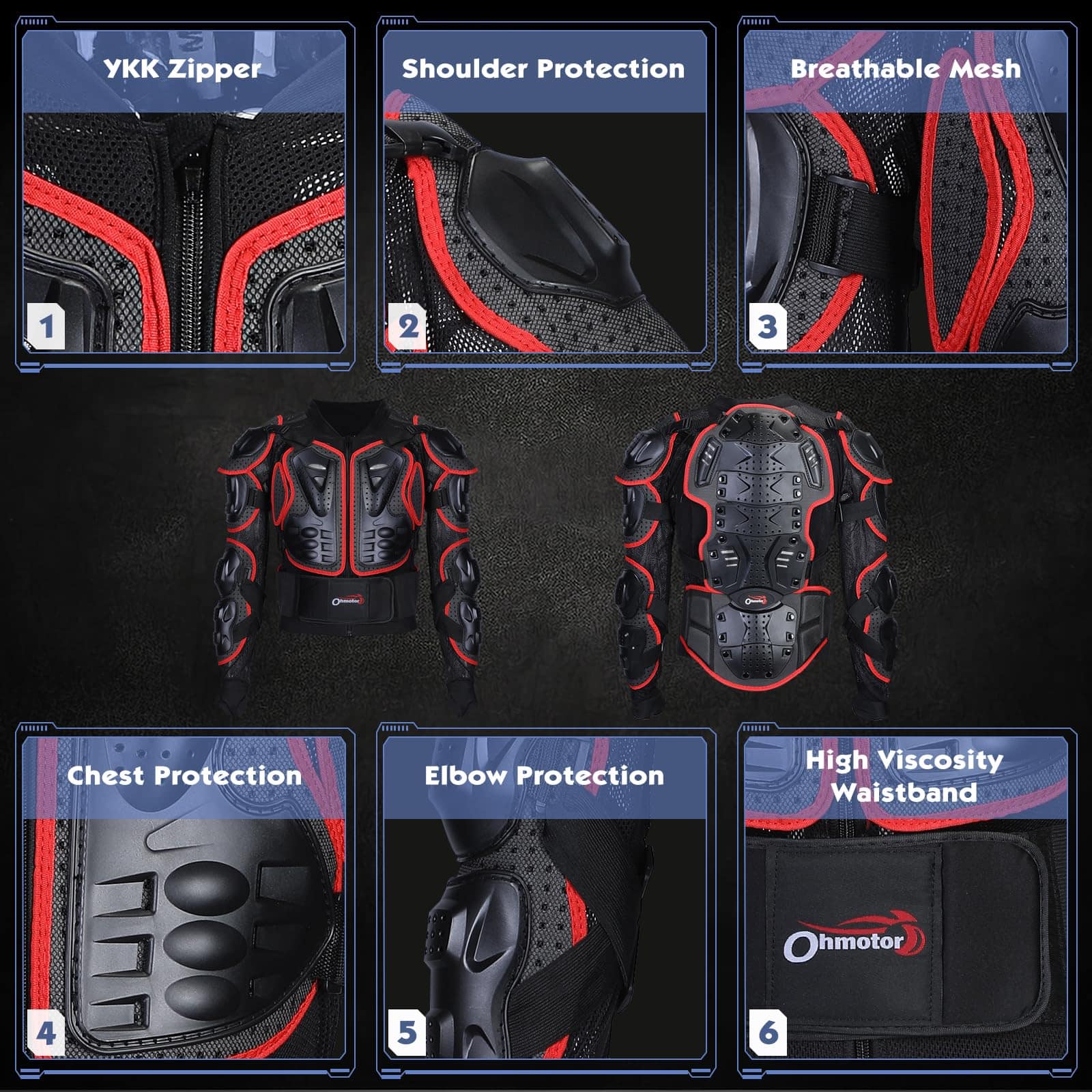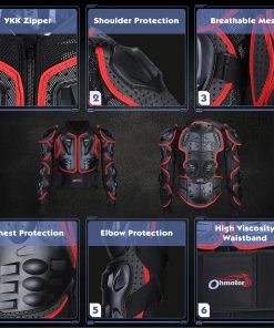 1. Material resistente y función anti-colisión: El chaleco protector de motorcross OHMOTOR está hecho de plástico duro de alta calidad, plástico PE de alto impacto y almohadilla protectora de EVA que proporciona protección adicional, las áreas vulnerables como pecho, espalda, hombros, codos y antebrazos están protegidos en zonas duras con cojines de concha para proteger las partes importantes del cuerpo y brindar una mejor protección integral.