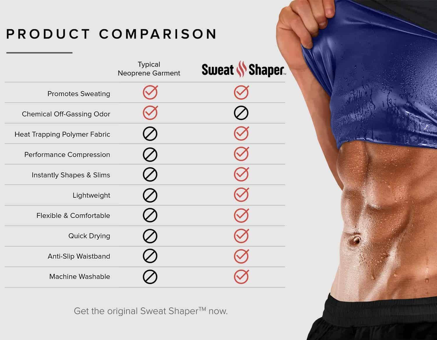 1. ADVANCED SWEATWEAR: Only Sweat Shaper uses a heat-trapping polymer fabric to boost your natural body heat and stimulate sweating with any type of physical activity. Wearing Sweat Shaper while working out or while performing daily activities creates a hot sauna-like experience. Your body temperature will rise, causing you to sweat more.