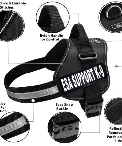 Este chaleco para perro de apoyo emocional sin tirón fue diseñado por Doggie Stylz pensando en su conveniencia y la seguridad de su perro. Haga que sus salidas públicas o el entrenamiento de su animal de servicio sean mucho más agradables para todos. Nuestro chaleco de movilidad para perros ESA deja claro de inmediato que su animal de servicio está trabajando y evitará que se acerquen a su animal de apoyo emocional. El chaleco para perros de trabajo Doggie Stylz cuenta con correas reflectantes, ribetes y parches de gancho y bucle desmontables que proporcionan una excelente visibilidad nocturna para mantener a su perro seguro. El asa en la parte superior proporciona al manejador un control adicional en todas las situaciones. Está diseñado con correas ajustables de nylon duradero. La parte inferior está hecha de neopreno que añade refuerzo y protege contra abrasiones como pocos materiales lo hacen. Un anillo en D de acero inoxidable resistente está ubicado en la parte superior del arnés, lo que lo convierte en un excelente arnés para perros sin tirón y evita el ahogo. El anillo en D es fácil de conectar a la correa de su perro o a la identificación de perro ESA. Todo el arnés de movilidad para apoyo emocional está doblemente cosido para agregar resistencia para todas las actividades. Dos correas ajustables para asegurar un ajuste personalizado específicamente para su perro. La hebilla de liberación rápida hace que este arnés sea el más fácil de poner y quitar que ofrece el mercado.