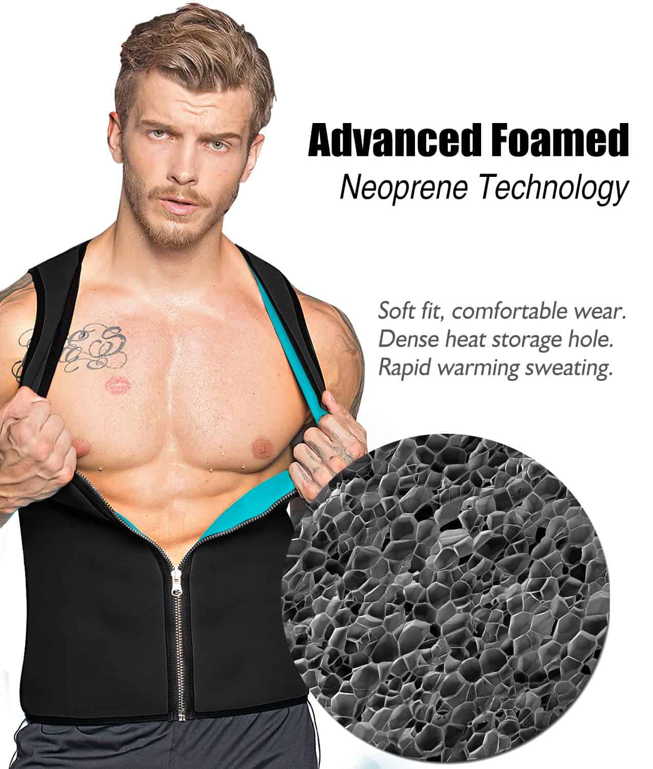 1. EFECTO EFICIENTE DE SAUNA PARA SUDOR: Este chaleco de sudor está hecho de material avanzado de caucho cloropreno, que puede sudar hasta 5 veces más que la ropa de fitness regular. La sauna de neopreno elimina rápidamente el sudor de la superficie del cuerpo, acelera el metabolismo, promueve eficazmente la quema de grasa y acorta el período de recuperación después del ejercicio.