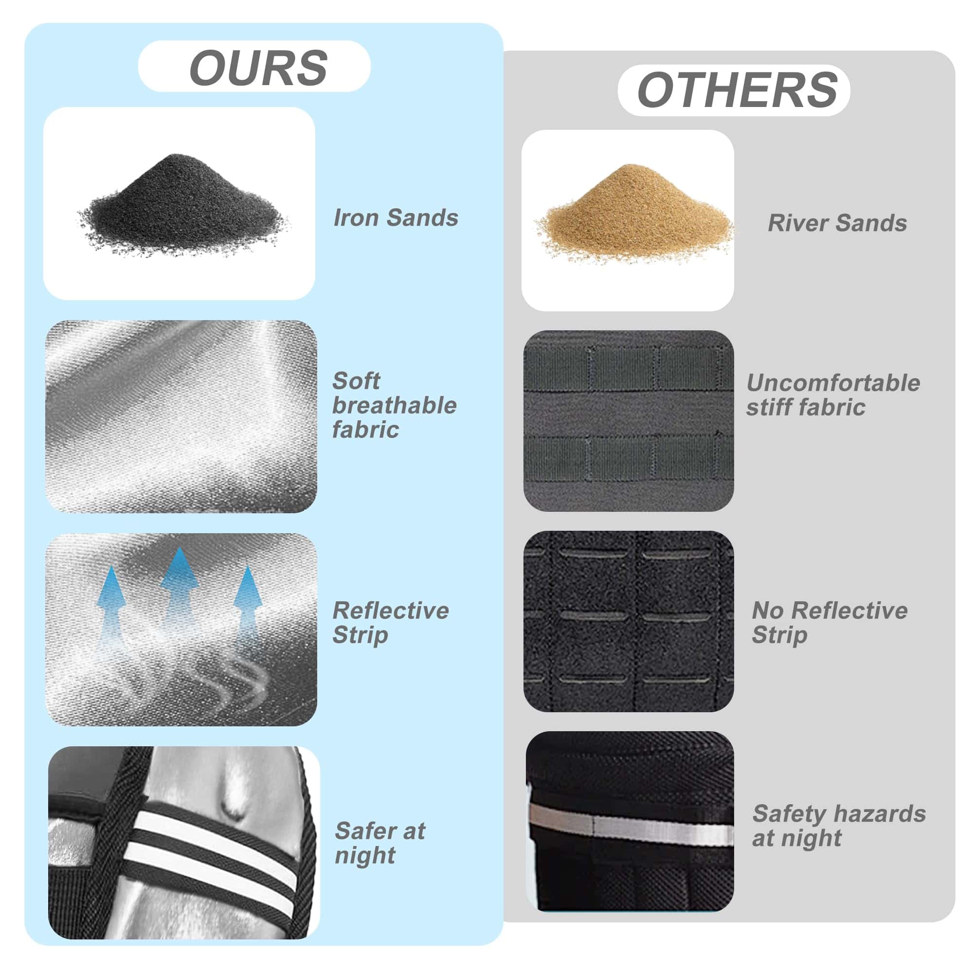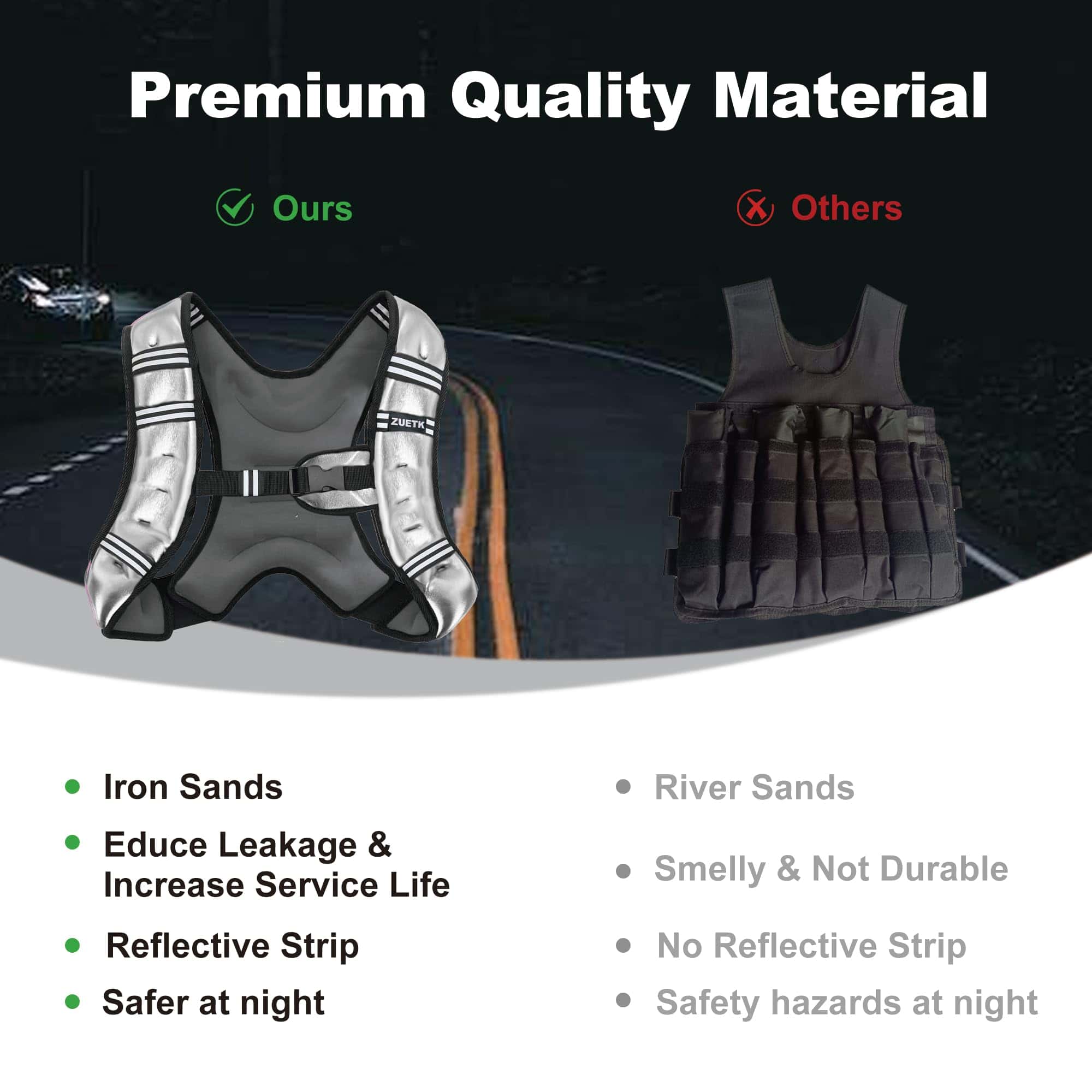 4. Correas ajustables y rayas reflectantes: Cada chaleco con peso tiene correas ajustables para evitar deslizamientos, asegurando un mejor ajuste para usuarios de todos los tamaños de pecho y mejorando la eficiencia del ejercicio. Las rayas reflectantes en ambos lados del chaleco con peso reflejan los faros de los vehículos para una carrera nocturna más segura, manteniéndote alejado de accidentes de tráfico en cualquier condición climática (lluvia, niebla, oscuridad), de día o de noche.