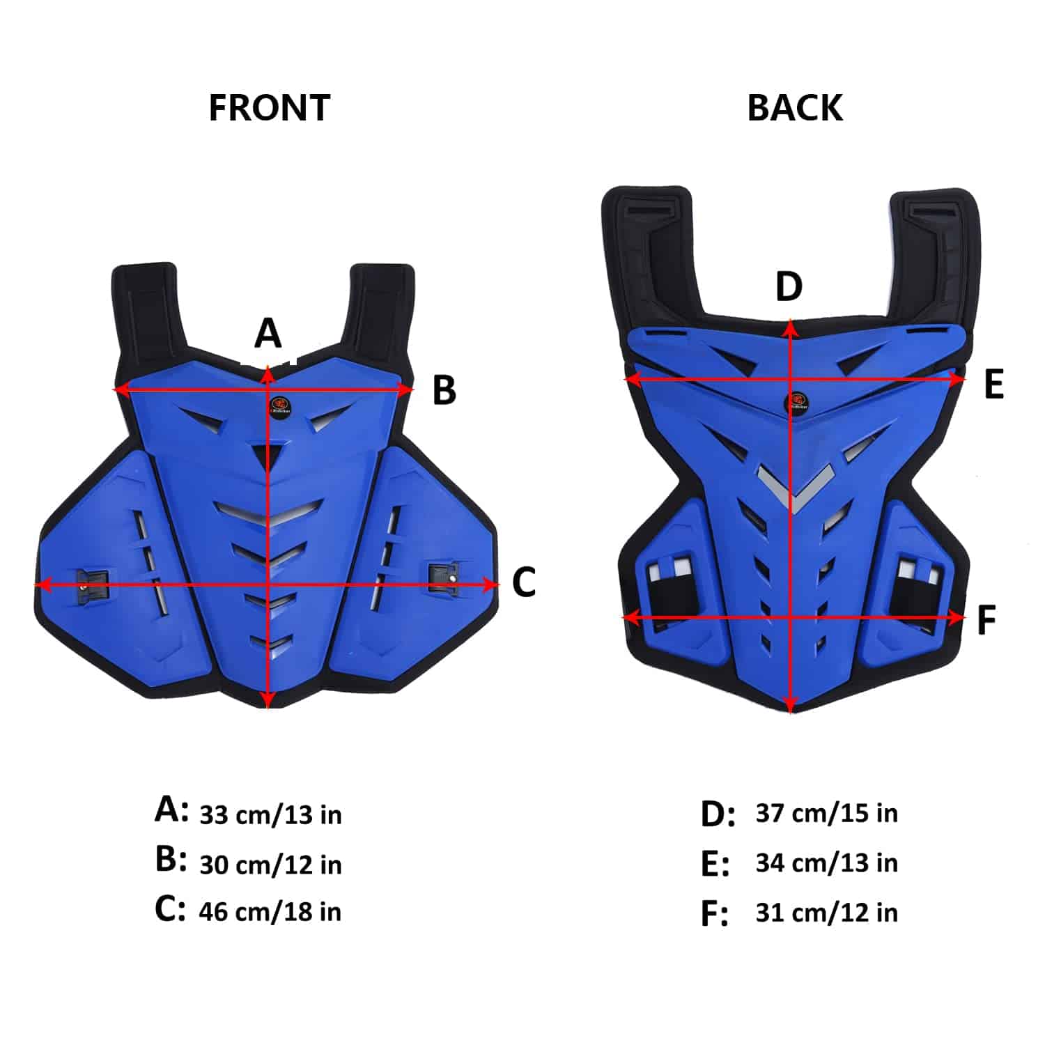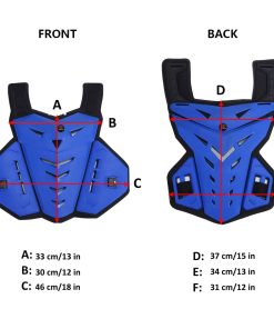 Características: br Marca: RidbikeColor: Negro/Blanco/Rojo/Azul/Verde/Naranja br Material: caparazón de plástico PP, interior con Lycra y tela acolchada de espuma alta. bTamaño ajustable: talla única para todos. br Circunferencia mínima de cintura: 30 pulgadas (ajustar al más corto, no estirar) br Circunferencia máxima de cintura: 59 pulgadas (con un 90% de estiramiento) br Peso: 1.39 libras bPaquete incluido: br 1 x Protector de Pecho