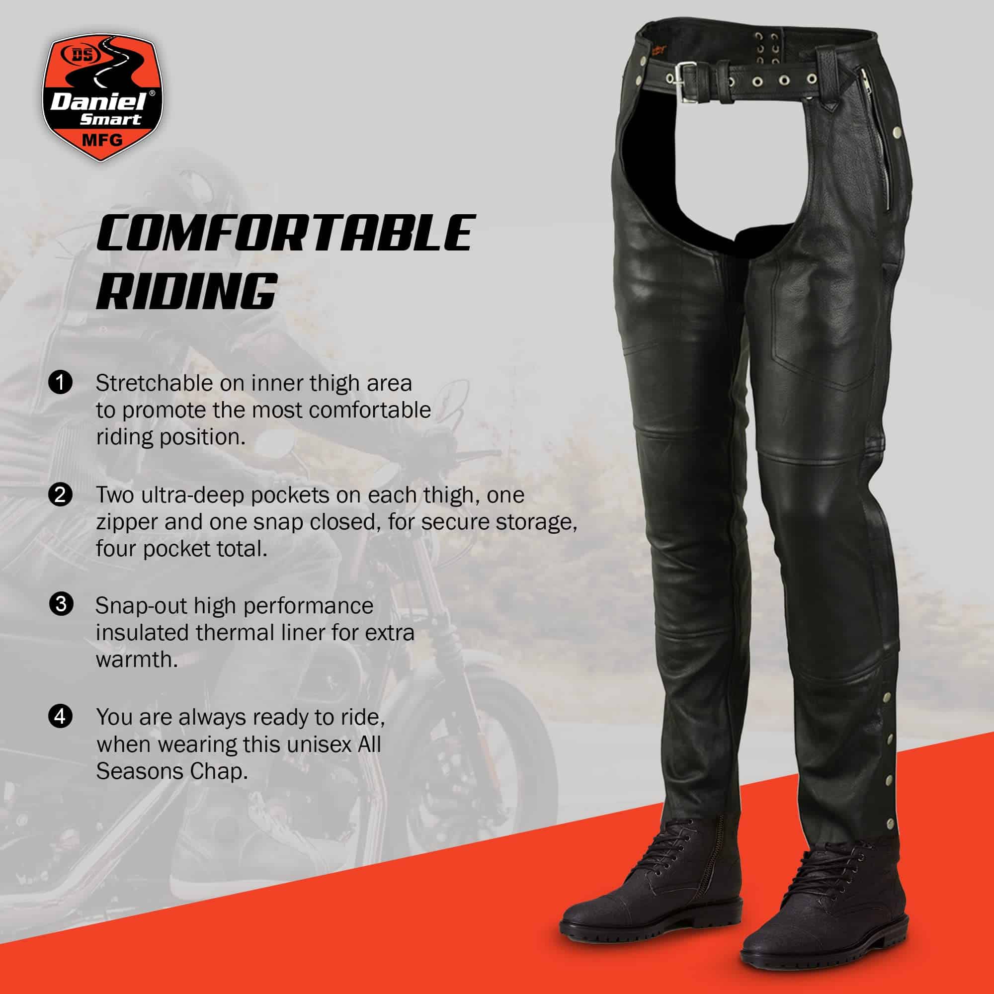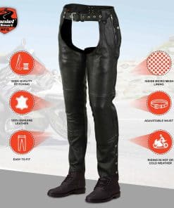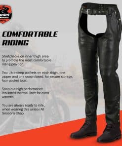 2. Comodidad todo el día: Nuestros chalecos de cuero sin nalgas vienen con elasticidad adicional en el muslo interno para libertad de movimiento durante viajes largos y un forro interior térmico de alto rendimiento desmontable y una capa de forro de malla para transpirabilidad y comodidad en clima caliente o frío.