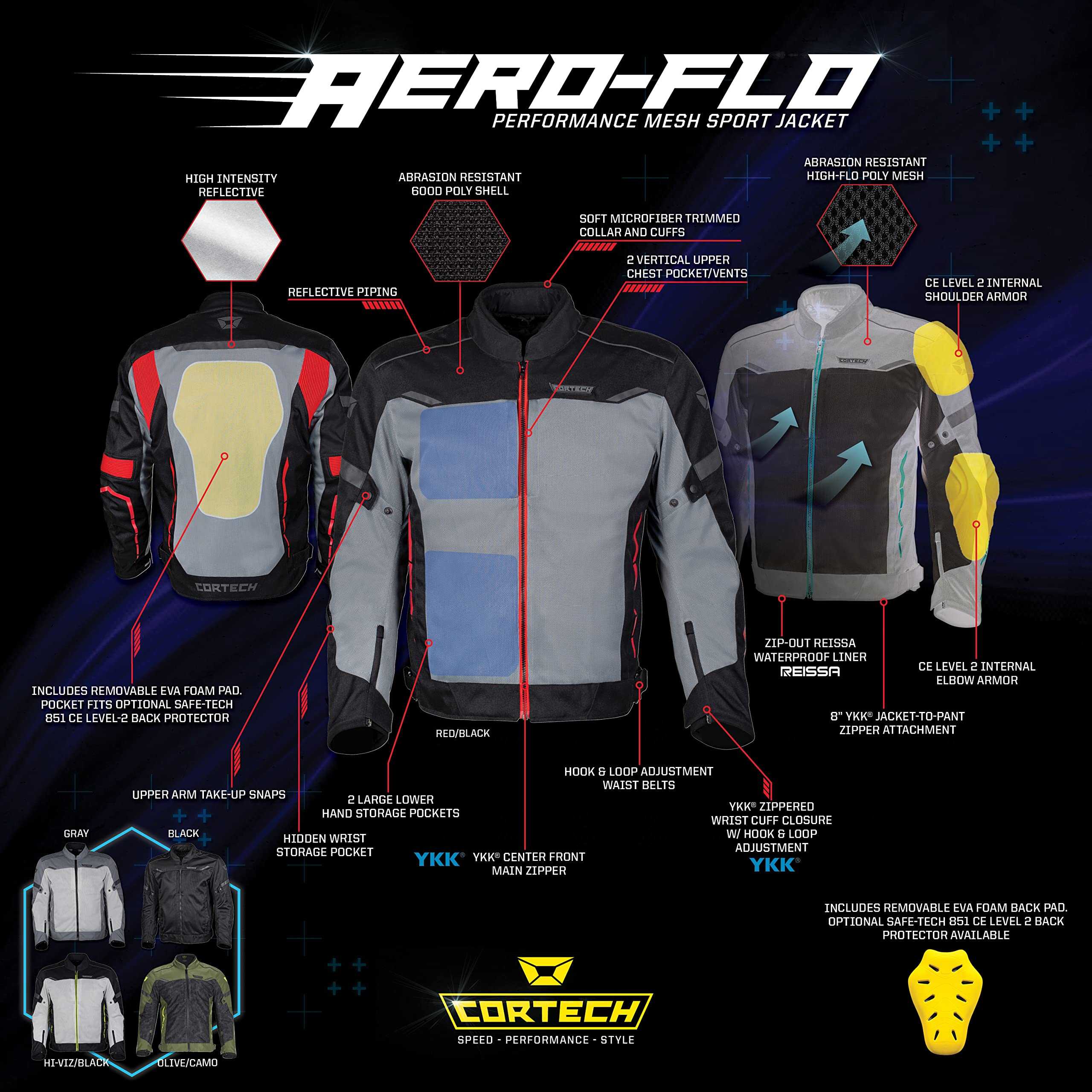 1. Ajuste de rendimiento con carcasa resistente a la abrasión: La chamarra Cortech Aero-Flo cuenta con una carcasa de poliéster 600D con paneles de malla que ofrecen una excelente ventilación mientras te mantienen protegido durante un paseo. El ajuste de rendimiento asegura que la chamarra se mantenga ajustada y cómoda incluso durante largas horas en la carretera.