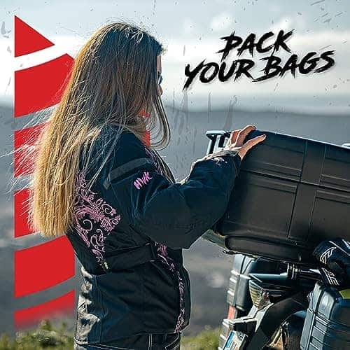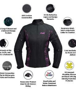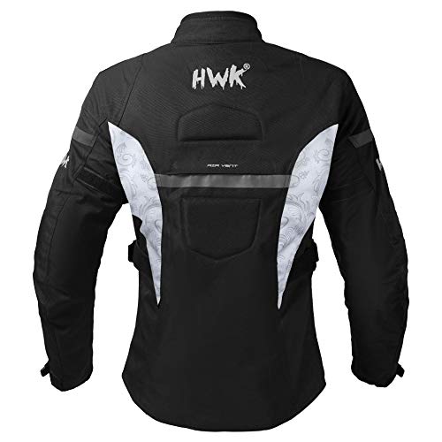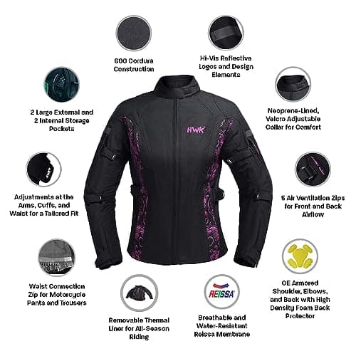 HWK es una marca establecida por motociclistas para motociclistas. Vivimos en un país con muchos extremos climáticos, donde puedes encontrarte con las cuatro estaciones. Aquí es donde creció el equipo de HWK, por lo que entendemos las características y funciones requeridas para una chamarra de moto de turismo para mujeres todo terreno que sea resistente al viento y al agua. Nuestra chamarra de moto para mujeres tiene una capa exterior de tela de poliéster 600D Cordura, membrana Reissa transpirable y forro térmico aislante desmontable. La armadura CE en la espalda, codos y hombros proporciona protección adicional, mientras que cinco paneles de ventilación mantienen la chamarra fresca en clima cálido. Esta chamarra textil para mujeres cuenta con logos reflectantes de alta visibilidad HWK y elementos de diseño de colores que te mantienen visible en condiciones de poca luz. Esta chamarra de motociclista para mujeres está cortada para adaptarse, con un cuello forrado de neopreno con cierre de velcro ajustable, además de botones fácilmente ajustables a lo largo de los brazos, puños ajustables con velcro y correas de gancho y bucle en la cintura. Mantén tus pertenencias seguras con dos bolsillos internos grandes y dos bolsillos externos grandes. Conecta de forma segura tu Chamarra de moto HWK a tus Pantalones de moto HWK utilizando una cremallera de conexión en la cintura de alta resistencia. Elige tu talla de chamarra para mujeres basándote en la medida de tu pecho, desde S – 36 hasta 4XL – 47. En caso de estar entre tallas, elige la más pequeña para un ajuste ceñido o la más grande para un ajuste holgado. CALIDAD MÁXIMA a PRECIO MÍNIMO. Nuestra chamarra de moto para mujeres es una ganga. Apostamos a que no puedes encontrar una chamarra de moto con armadura a este precio en el mercado de accesorios y ropa protectiva para motocicletas. Sigue a HWK en Instagram y Facebook para ser parte de nuestro creciente grupo de ENTUSIASTAS DE LA AVENTURA!