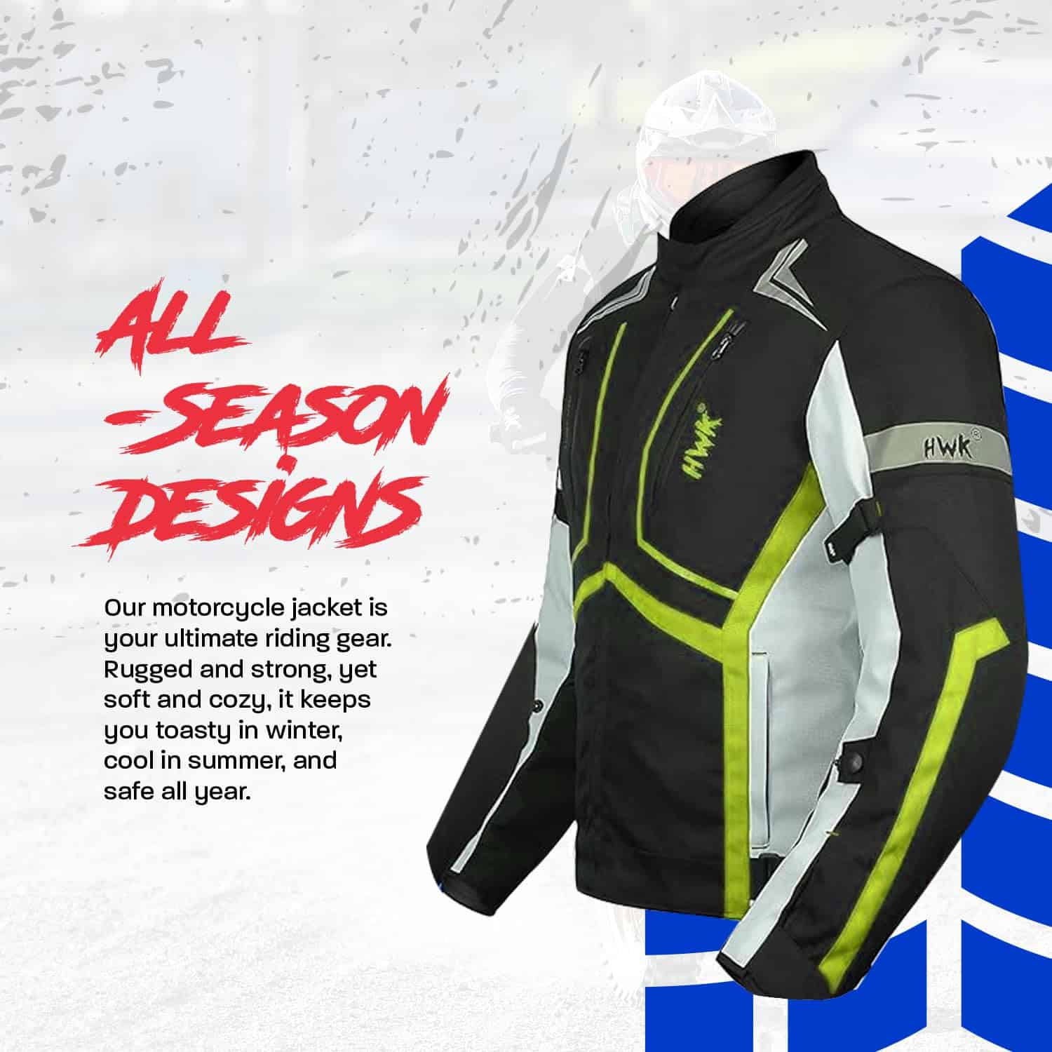 1. Protección para todas las estaciones. Acepta la aventura y conduce con la Chamarra de Moto HWK Scorpion. Esta equipación de moto para todas las estaciones y todo tipo de clima te mantiene caliente en invierno, fresco en verano y seguro en cada milla.