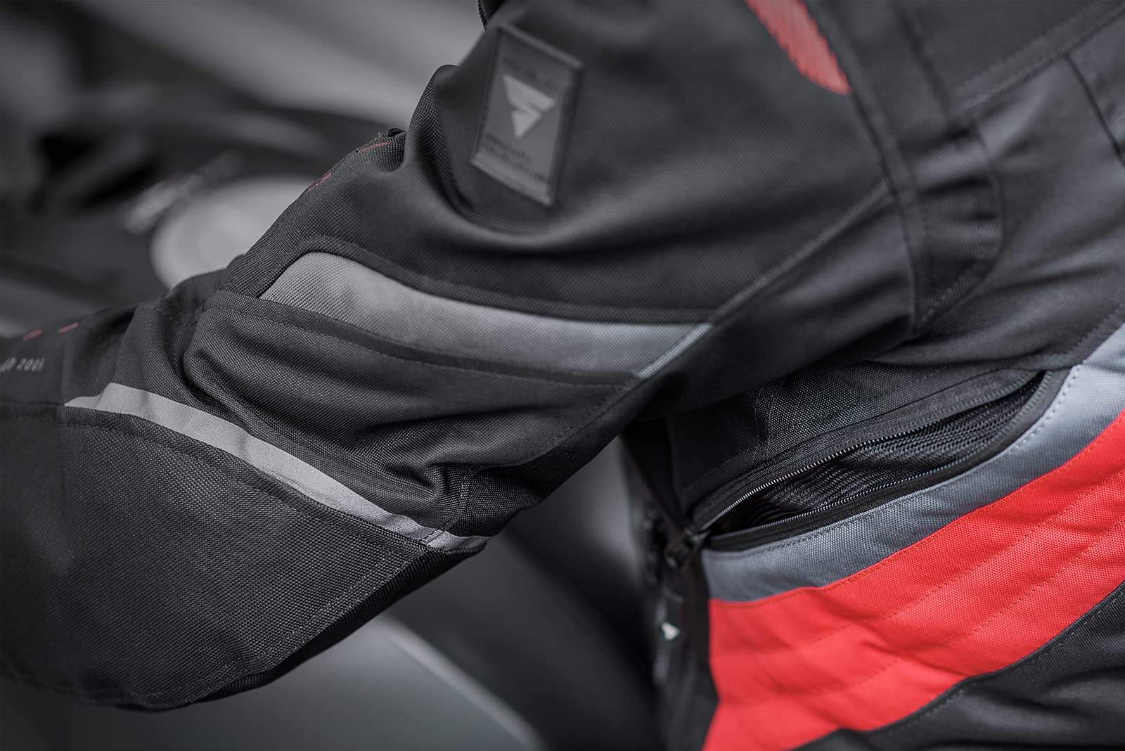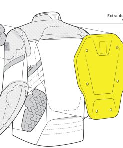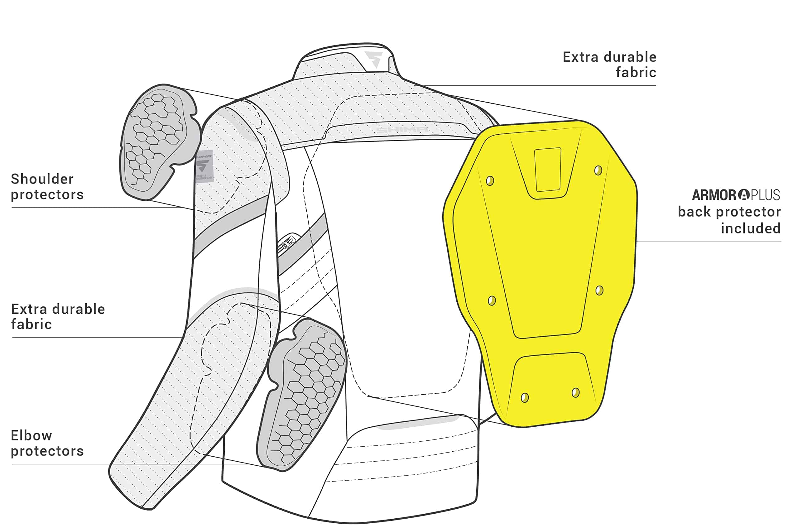 2. PROTECCIÓN – protectores CE certificados para espalda, hombros y codos y tela extra resistente al desgaste en hombros y codos, costuras dobles reforzadas.