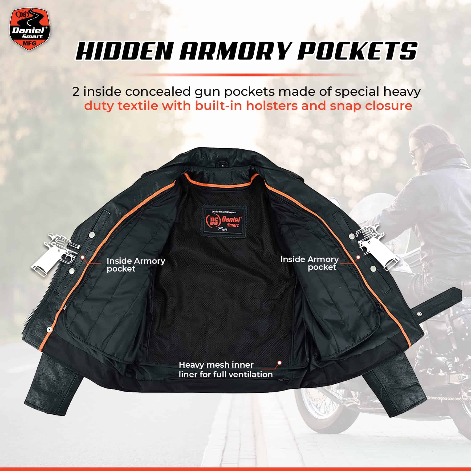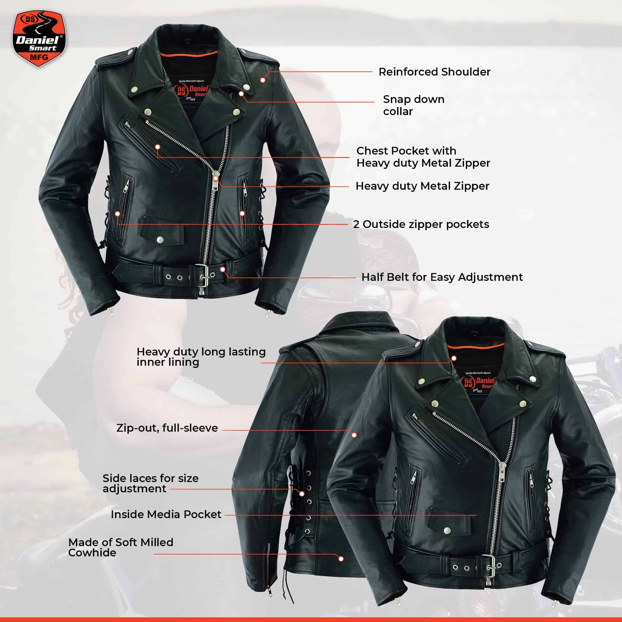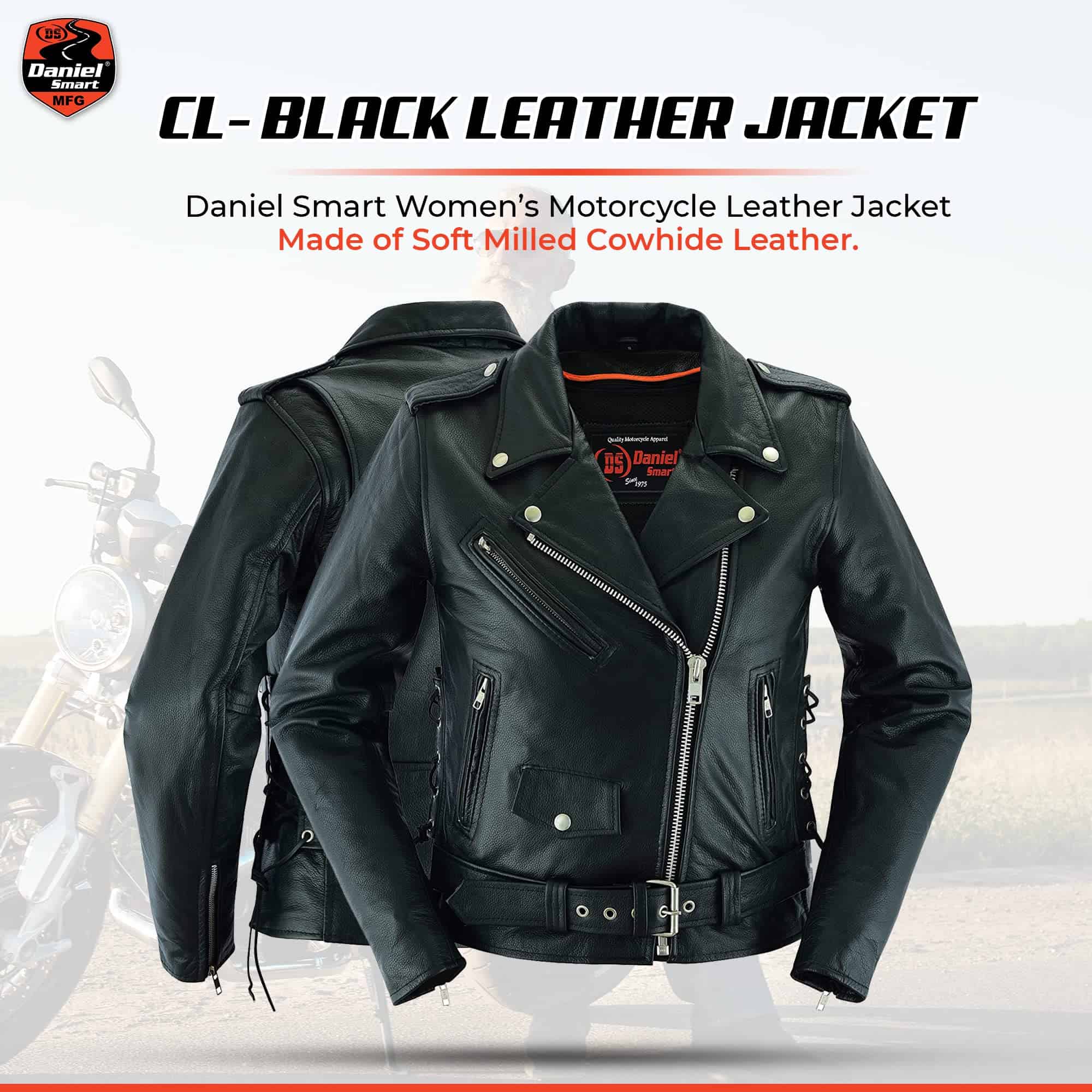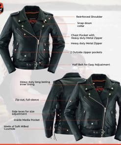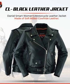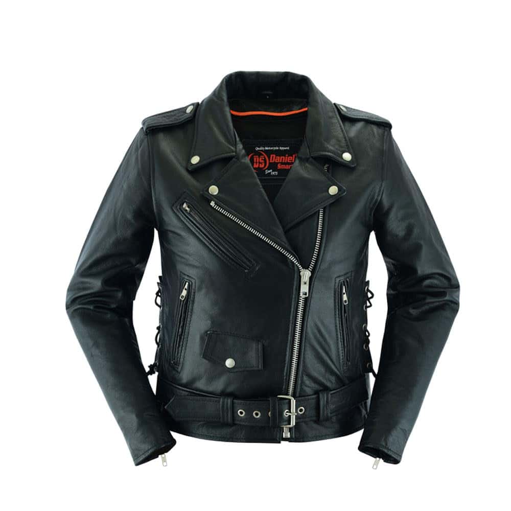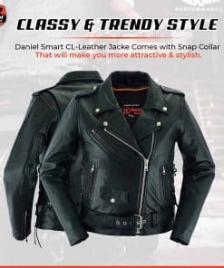 Chamarra de Motociclista para Mujer de Daniel Smart hecha de cuero de vaca suave de la mejor calidad con un panel elástico en la espalda para mayor protección en carretera. Cuenta con refuerzo en los hombros para mayor ocultamiento de armadura. La chamarra negra de motociclista tiene cordones laterales para un ajuste personalizado. El forro acolchonado de alta calidad asegura mayor calidez en condiciones de frío. Viene con dos bolsillos interiores de armadura oculta con cierre de broches y un bolsillo interior regular. Además, tiene un medio cinturón para un ajuste fácil y cómodo durante la conducción. Disponible en tallas desde XS a 6XL para garantizar el mejor ajuste. Ideal para mujeres que desean un estilo moderno y elegante. La chamarra de motocicleta para mujeres viene con una garantía de satisfacción o devolución de dinero para que estés completamente feliz con tu compra.