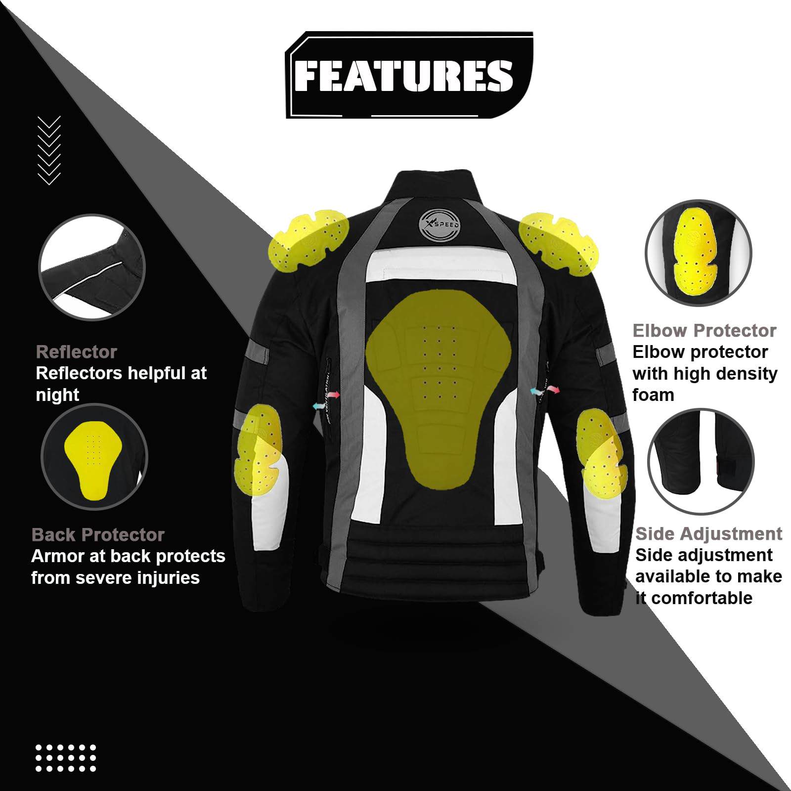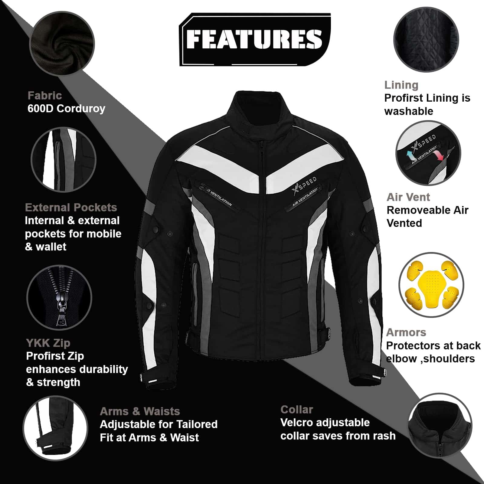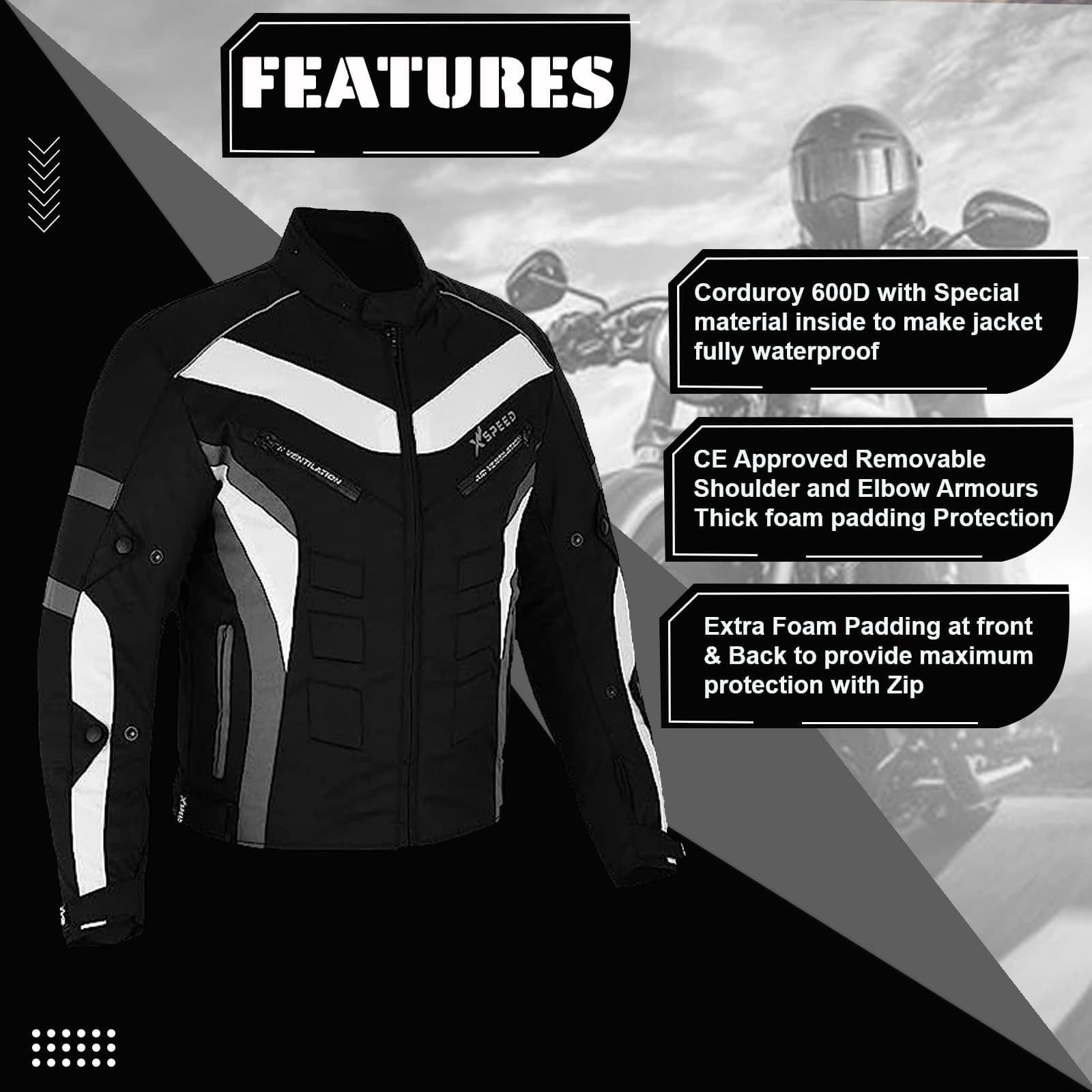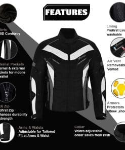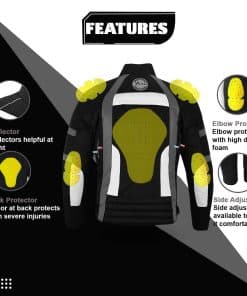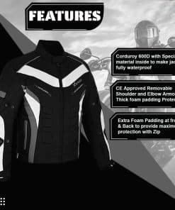 Chaqueta impermeable para moto para hombres en material de tela Cordura 600d – Diseño de 6 paquetes con protecciones aprobadas por CE extraíbles en hombros y codos. Espuma gruesa acolchada en la espalda con ajustes en puños y cintura con correa de velcro. Cierre completo de cremallera YKK con ventilaciones de aire en la parte delantera y trasera. Forro removible y lavable para todo tipo de clima. Bolsillo para celular en el interior con almohadillas de espuma adicionales en la parte delantera y trasera para brindar máxima protección.
