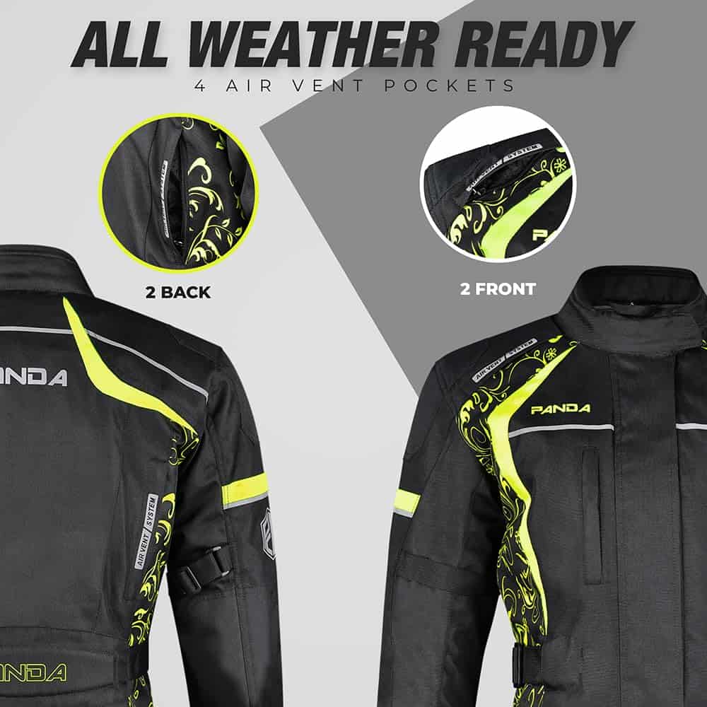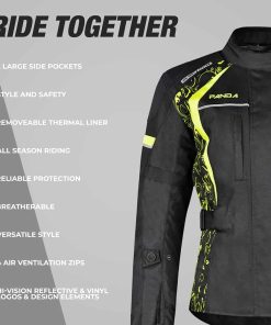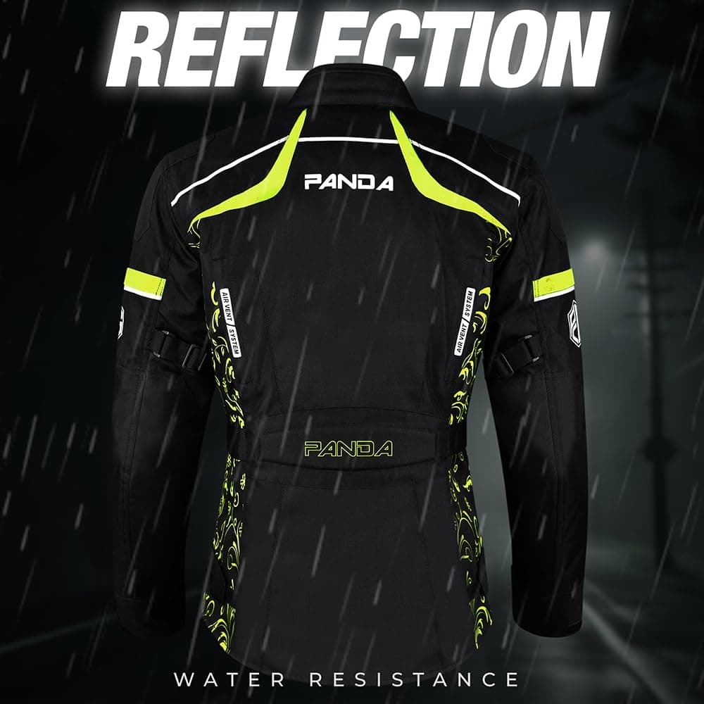Chamarra para Motocicleta de Mujer PANDA CYCLE GEAR Impermeable para Todas las Estaciones con Armadura CE para Enduro Dual Sports Riding Touring Adventure Motorbike Jacket en color Verde y talla 5XL. Esta chamarra para mujer, hecha de tela Cordura 600D, es duradera y adecuada para paseos diarios y aventuras off-road. El cuello de espuma evita molestias durante paseos prolongados y proporciona semiprotección a través de capas dobles de almohadillas de espuma en la espalda. Experimenta una protección premium con armadura aprobada por CE en zonas críticas de impacto, brindando defensa superior contra posibles lesiones al tiempo que mantiene flexibilidad y comodidad para paseos prolongados. Asegurando máxima seguridad, esta chamarra para moto presenta 5 piezas de armadura aprobadas por CE, incluyendo 2 en los hombros, 2 en los codos y 1 en la espalda, todas convenientemente extraíbles para adaptarse a tus preferencias. Disfruta del ajuste perfecto con 10 puntos ajustables, lo que te permite adaptar la chamarra con precisión a tu forma corporal y estilo de conducción sin esfuerzo. Adáptate sin problemas a las condiciones climáticas cambiantes con un forro térmico removible, manteniéndote abrigado cuando las temperaturas bajan y fácilmente desmontable para viajes más cálidos. Este diseño está pensado para ser utilizado durante todo el año. Mantente fresco y seco con nuestro avanzado sistema de flujo de aire, que cuenta con 4 ventilas de aire garantizando una ventilación óptima a lo largo de tu viaje. Conduzca con confianza gracias a los logotipos reflectantes de alta visibilidad en el frente, espalda y brazos, mejorando tu visibilidad para otros conductores y garantizando una conducción más segura, especialmente en condiciones de poca luz. La chamarra motociclista Panda está disponible en tallas que van desde la Small hasta la 5XL, asegurando un ajuste perfecto para pilotos de todos los tipos de cuerpo. Elije entre una variedad de colores vibrantes para combinar con tu estilo personal, mientras disfrutas de las mismas características premium y protección superior ofrecidas por este renombrado diseño de chamarra.