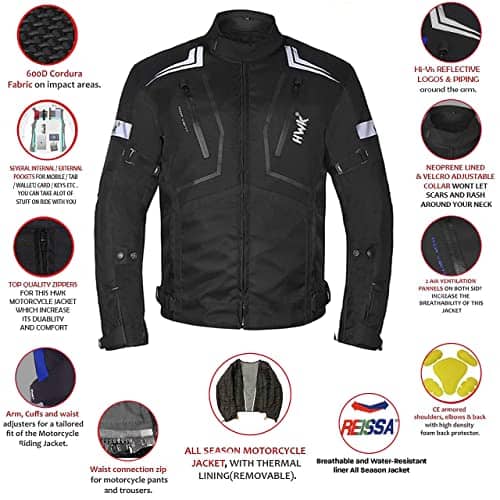 HWK es una marca establecida por motociclistas, para motociclistas. Vivimos en un país con muchos extremos climáticos, donde puedes experimentar las cuatro estaciones. Aquí es donde creció el equipo de HWK, por lo que entendemos las características y funciones necesarias para una chamarra de motocicleta para todas las temporadas que sea resistente al agua y al clima. Nuestra chamarra de motocicleta HWK Escorpión es resistente y fuerte, pero suave y cómoda. Te mantendrá caliente durante el invierno, fresco durante el verano, y seguro en todo momento. Está hecha de una tela de malla micro y membrana transpirable Reissa que te mantiene cómodo en todas las condiciones de manejo. Cinco bolsillos de ventilación de aire te mantienen fresco durante el verano, mientras que un forro térmico extraíble te mantiene caliente durante el invierno. Ajusta cómo se adapta tu chamarra con correas de velcro en los brazos, muñecas, cuello y cintura. Conecta tu chamarra biker textil y pantalones con una cremallera de alta calidad. Combina tu chamarra con tus pantalones de motocicleta HWK para una conexión perfecta. Viaja seguro y confiado con armadura CE en los codos, hombros y espalda, tela Cordura de poliéster 600D en áreas de alto impacto, y acolchado de espuma de alta densidad en la parte posterior de tu chamarra de motocicleta enduro. Mantén tus objetos de valor seguros con los amplios bolsillos de almacenamiento externos e internos en tu chamarra deportiva de doble deporte. Un logo reflectante de HWK en el pecho y ribete blanco de alta visibilidad a lo largo de los hombros y brazos te mantendrán visible en condiciones oscuras. Elige entre nuestra selección de diseños todo negro y de 3 colores contrastantes. Elige tu chamarra de escorpión basado en esta guía de tamaño de medición del pecho (pulgadas): S – 38», M – 40», L – 42», XL – 44», 2XL – 46», 3XL – 48» 4XL – 50», y 5XL – 52». Si estás entre tallas, elige la talla más grande para un ajuste fácil. CALIDAD MÁXIMA al PRECIO MÍNIMO. Apostamos a que no puedes encontrar accesorios de motocicleta para hombres y mujeres a este precio en el mercado de equipo de protección de motocicletas para hombres y mujeres. HWK para ser parte de nuestro creciente grupo de ENTUSIASTAS DE MOTOS!