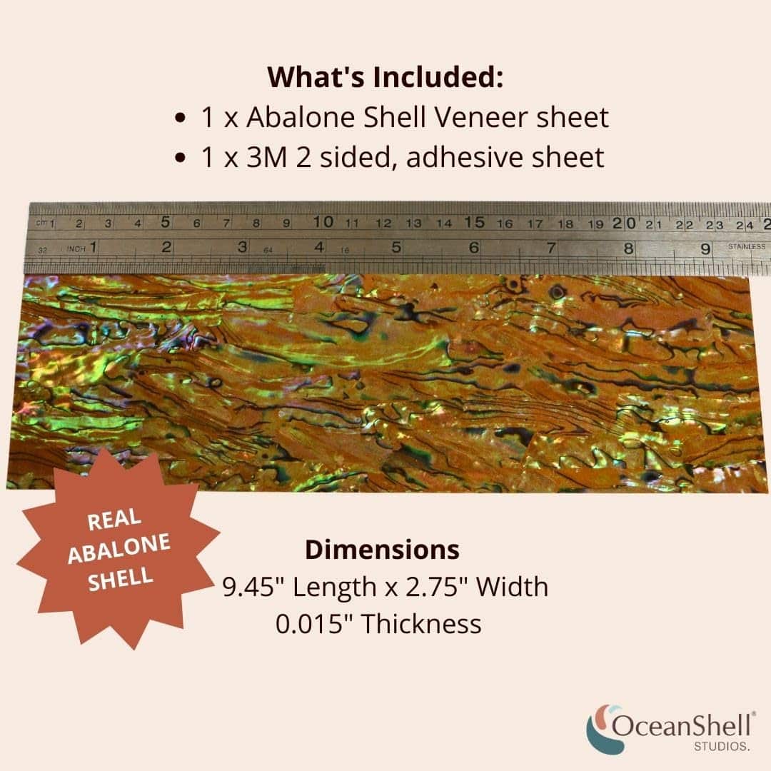 Chapado de concha de abulón para adornos de incrustaciones DIY o profesionales. Hecho de finas láminas de concha de abulón exclusivamente, SIN laminados de plástico. Las láminas de concha están especialmente unidas en una hoja y están recubiertas con un acabado brillante. Nuestras conchas son obtenidas de forma sostenible por nuestro negocio familiar en Nueva Zelanda y son rastreables. Viene con cinta adhesiva de doble cara que facilita aún más las incrustaciones. Se proporciona por separado para que la apliques en la parte trasera de la chapa de concha. Fácil de despegar. Las chapas también se pueden utilizar en muebles, obras de arte e instrumentos musicales, o para muebles más grandes del hogar, creaciones de carpinteros, y superficies de salpicadero. Las chapas se pueden utilizar para incrustaciones de joyería, incrustaciones en cajas, incrustaciones de guitarras e instrumentos musicales, proyectos creativos, arte de uñas de concha y manualidades educativas. Diseñadas para aplicaciones interiores, las chapas son una característica decorativa única que se puede agregar a una amplia gama de superficies para decorar y agregar valor. La concha es un producto natural con una variedad de factores que afectan su apariencia. La configuración de su pantalla también afecta su visualización de los colores e iridiscencia en las hojas de concha.