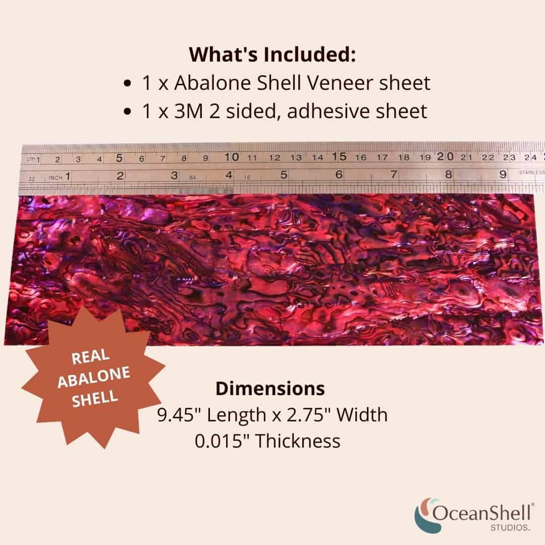 Chapado de Nacar Abulón para Decoración de Incrustaciones DIY o Profesionales – Sostenible y de alta calidad, este nacar abulón de Nueva Zelanda en tonos morados se destaca por su belleza natural. Cada lámina está hecha de finas rebanadas de concha de abulón, sin laminados de plástico, unidas cuidadosamente en una hoja y recubiertas con un acabado brillante. Nuestras conchas son obtenidas de manera sostenible por nuestro negocio familiar en Nueva Zelanda, garantizando su trazabilidad y calidad. La cinta de doble cara incluida hace que las incrustaciones sean aún más fáciles, ideal para proyectos de decoración de muebles, arte, instrumentos musicales y mucho más. Las láminas pueden ser utilizadas para incrustaciones en joyería, cajas, guitarras, proyectos creativos y artesanales, entre otros. Diseñadas para aplicaciones interiores, son un elemento decorativo único que agrega valor y embellece una amplia gama de superficies. La concha es un producto natural con una variedad de factores que afectan su apariencia, y las configuraciones de su pantalla también influyen en cómo ve los colores y el brillo en las láminas de concha.