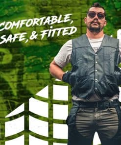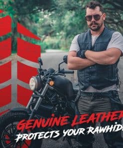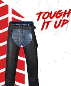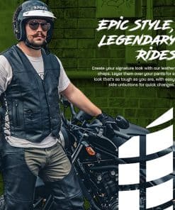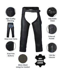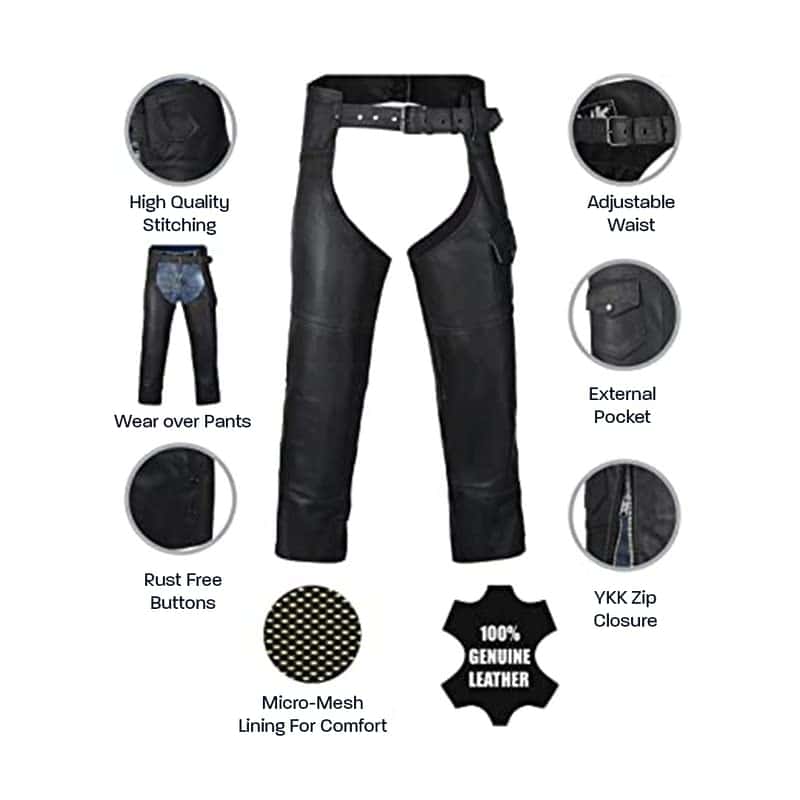 1. ¡Ride seguro! Tus chaps de vaquero están hechos de cuero negro de doble costura de 1.1 mm a 1.2 mm de grosor. Usa los chaps sobre tus pantalones para mayor protección contra los elementos y el roce del camino.