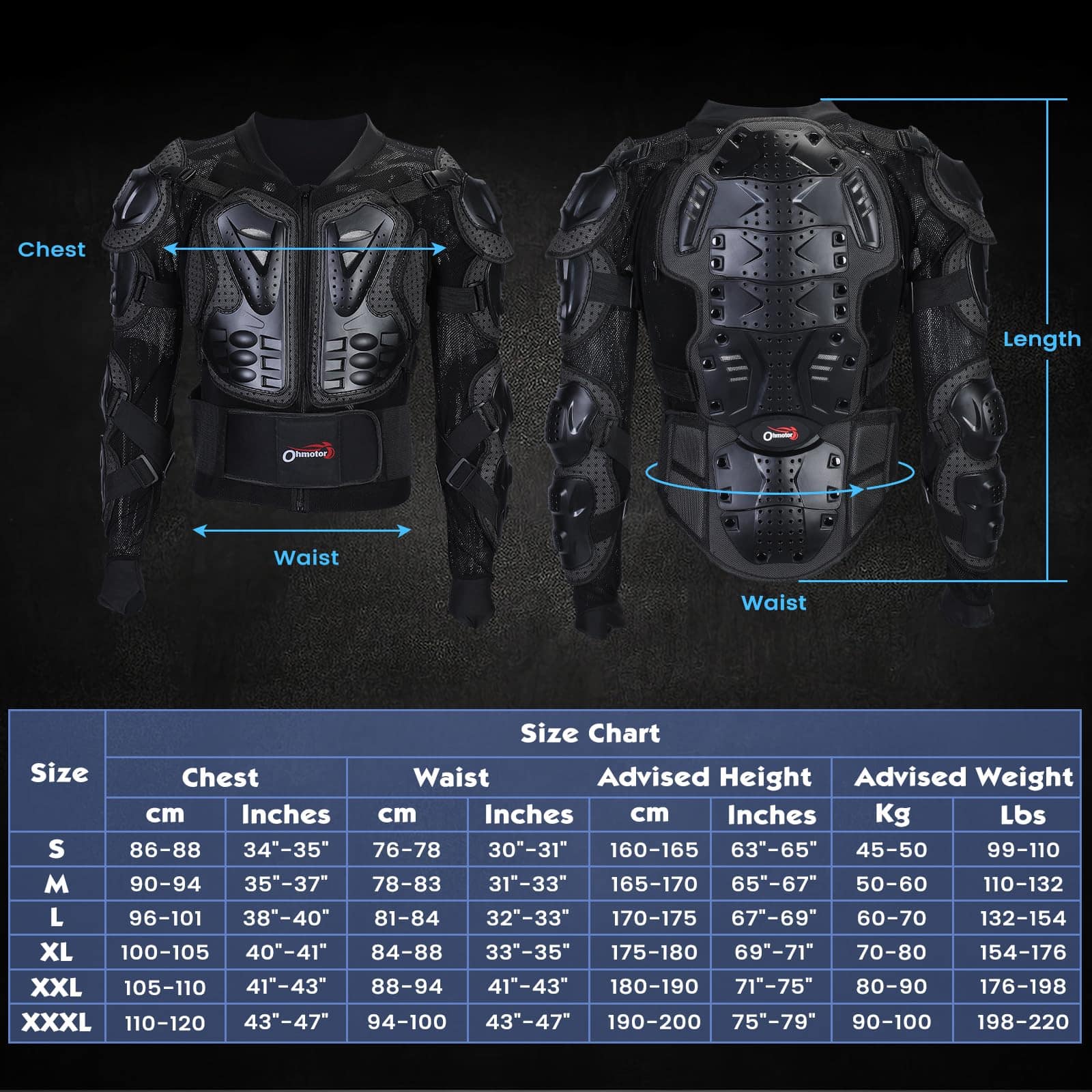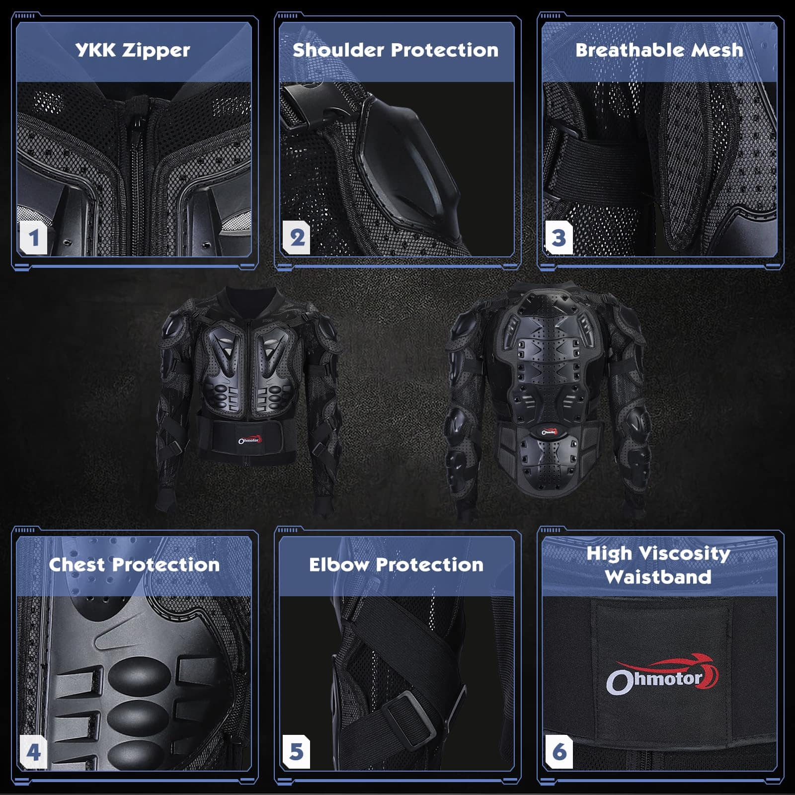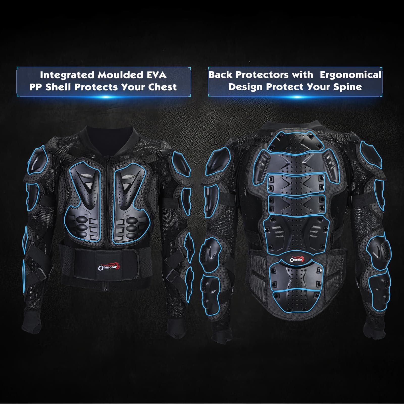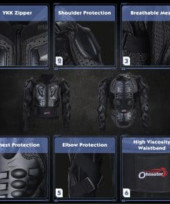1. Material resistente y función antibarro: La chaqueta protectora de motocross OHMOTOR está hecha de plástico duro de alta calidad, plástico PE de alto impacto y almohadilla protectora de EVA que proporcionan protección adicional.