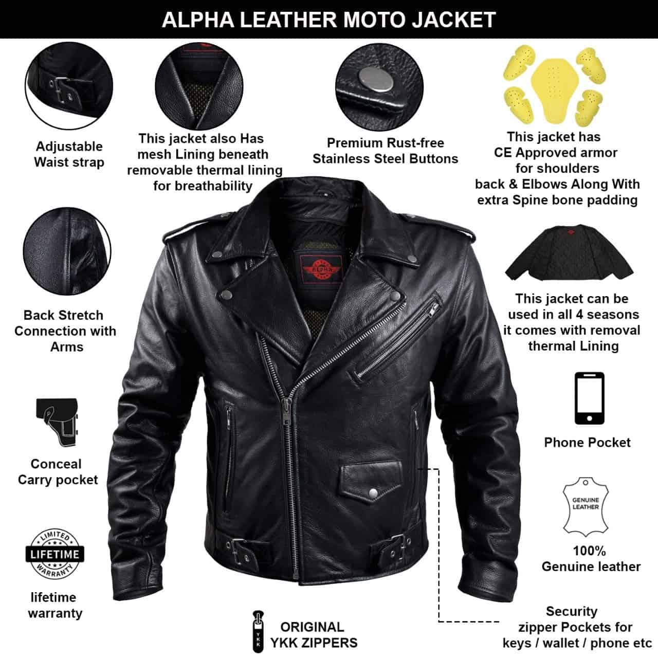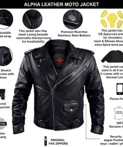 CHAQUETA DE CUERO NEGRA ALPHA PARA MOTOCICLETAS CON ARMADURA PARA HOMBRES La chaqueta de motocicleta para hombre Alpha es una chaqueta de protección aprobada por la CE que viene con cintura ajustable, puños con cremallera y armaduras ligeras extraíbles. Esta chaqueta de protección para deportes de motor de acción trasera está hecha de cuero genuino al 100% y viene con un bolsillo para llevar oculto. Este equipo de protección para montar en motocicleta también tiene botones de acero inoxidable premium sin óxido y cremalleras originales YKK. Esta chaqueta de moto con armadura es perfecta para el motociclista profesional. La chaqueta de piloto cuenta con un bolsillo para teléfono, bolsillos exteriores y un forro térmico desmontable para convertirla en una chaqueta de crucero. El forro de malla dentro de la chaqueta de cuero para montar en motocicleta permite la transpirabilidad, y el acolchado de espuma en la parte baja de la espalda proporciona protección adicional. La chaqueta de motocicleta de malla para hombres está hecha de cuero sin arrugas y está triple cosida para mayor durabilidad. Nuestra promesa: Cualquier problema con la chaqueta blindada Alpha para hombres, envíanos un mensaje que cubrimos tu compra. Estamos seguros de que no encontrarás chaquetas de cuero para hombres de tan alta calidad en cualquier otro lugar del mercado de equipo de protección para motocicletas. Tomamos menos ganancias para hacerlo asequible para nuestros compañeros motociclistas para una conducción segura en motocicleta. Busca Alpha cycle gear y encuentra más ofertas asequibles en chaquetas de cuero genuino para motocicletas, chalecos para motocicletas, pantalones con armadura para motocicletas y más.