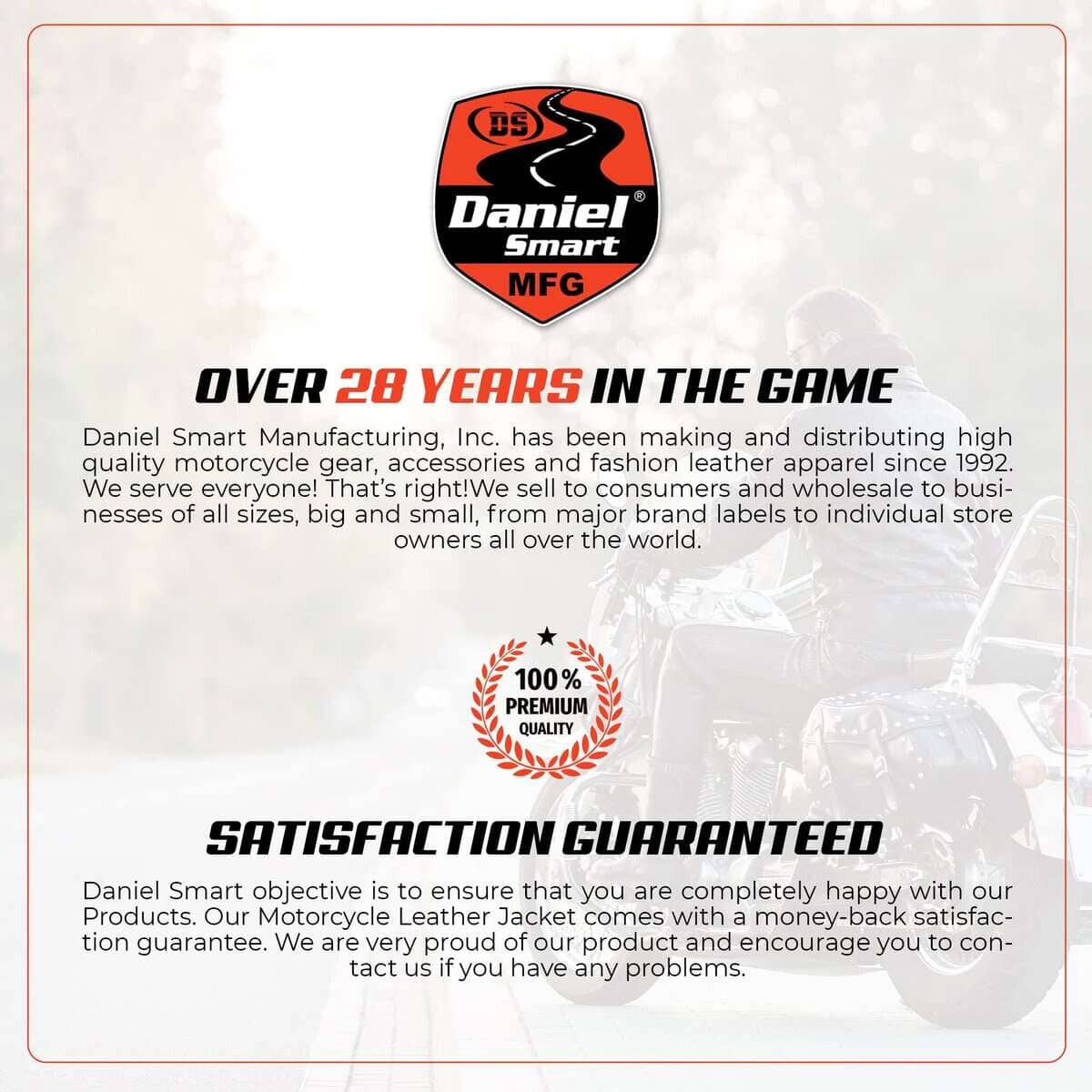 La chaqueta de cuero para hombres motociclistas de Daniel Smart está disponible en una variedad de tallas que van desde S- 8XL para garantizar que obtengas lo mejor. La chaqueta de cuero para hombres de Daniel Smart es un estilo inteligente y moderno para usar, ideal para viajeros o motociclistas que desean mantenerse en las carreteras. Para obtener más detalles, consulta la imagen de la tabla de tallas. La satisfacción está garantizada: el objetivo de Daniel Smart es asegurarse de que estés completamente feliz con nuestros productos. Nuestra chaqueta de cuero para hombres motociclistas viene con una garantía de satisfacción con devolución de dinero. Estamos muy orgullosos de nuestro producto y te animamos a que nos contactes si tienes algún problema y te proporcionaremos un reembolso sin ninguna pregunta.