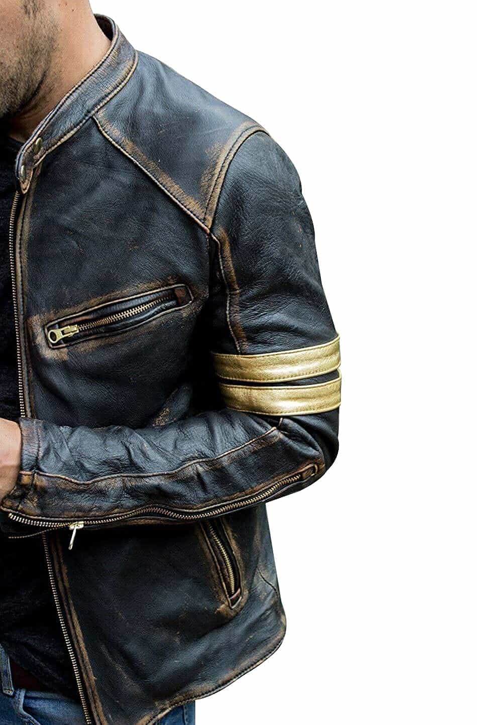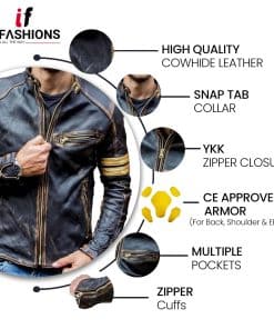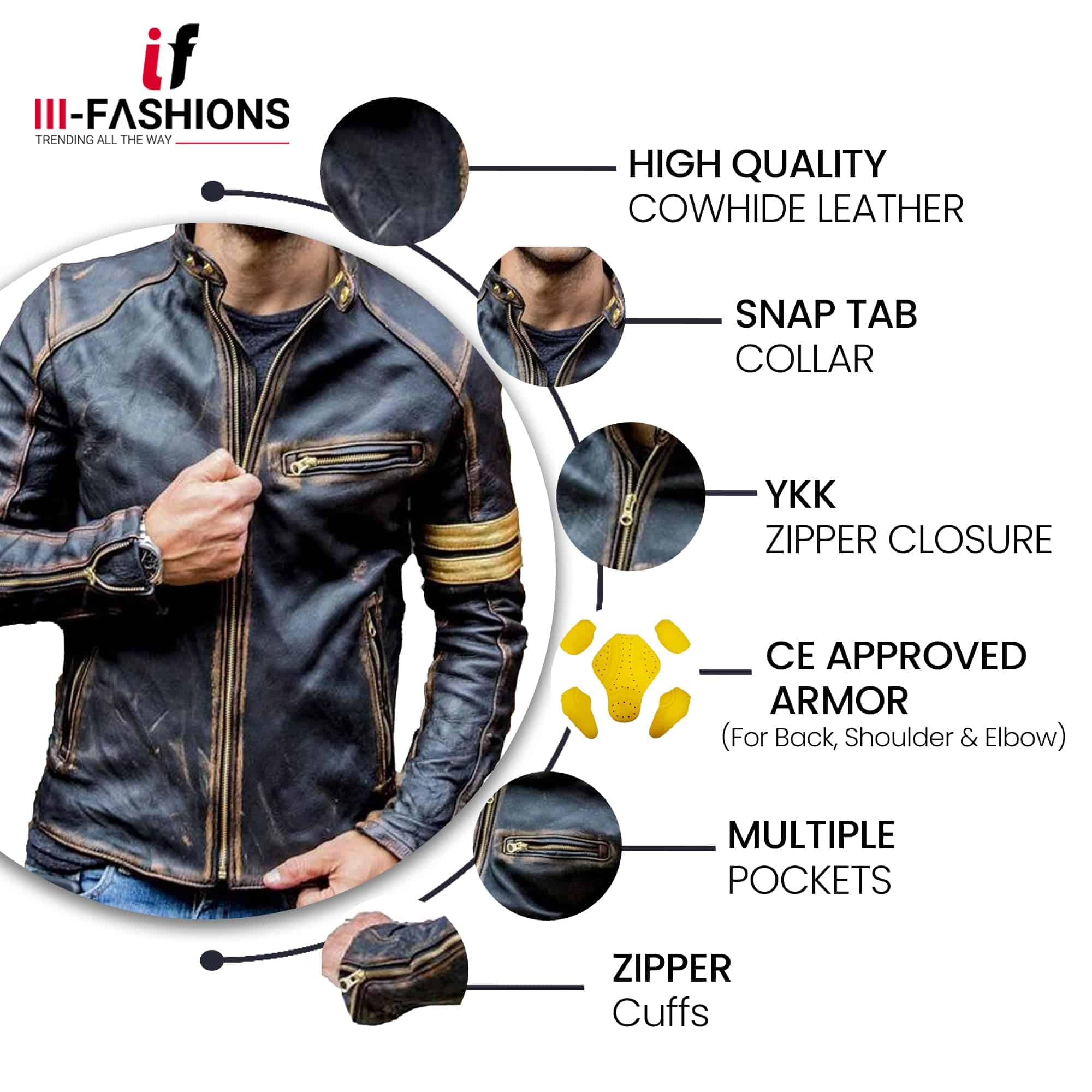 Chaqueta de Cuero Clásica y Duradera para Hombre con Protección Acolchada en Estilo Motociclista. Hecha de cuero de alta calidad, esta chaqueta de motociclista resistente y suave ofrece una sensación de durabilidad, cómoda y un aspecto desgastado natural. Diseñada para la combinación de estilo y seguridad, cuenta con protección acolchada CE en hombros, codos y espalda para una excelente protección sin perder comodidad. La chaqueta de motociclista de verano tiene un diseño práctico y elegante, que incluye un cierre frontal con cremallera seguro, múltiples bolsillos para almacenamiento, un cuello con cierre de broche, llamativas rayas doradas en las mangas y puños ajustables con cremallera para un ajuste perfecto. El suave forro interior añade calor y comodidad, lo que la convierte en una excelente opción para cualquier ocasión. Ya sea que estés montando en tu moto o saliendo casualmente, esta chaqueta de cuero combina la funcionalidad motociclista con la moda diaria. Con un ajuste relajado pero elegante, permite un fácil movimiento mientras mantiene un aspecto masculino elegante.