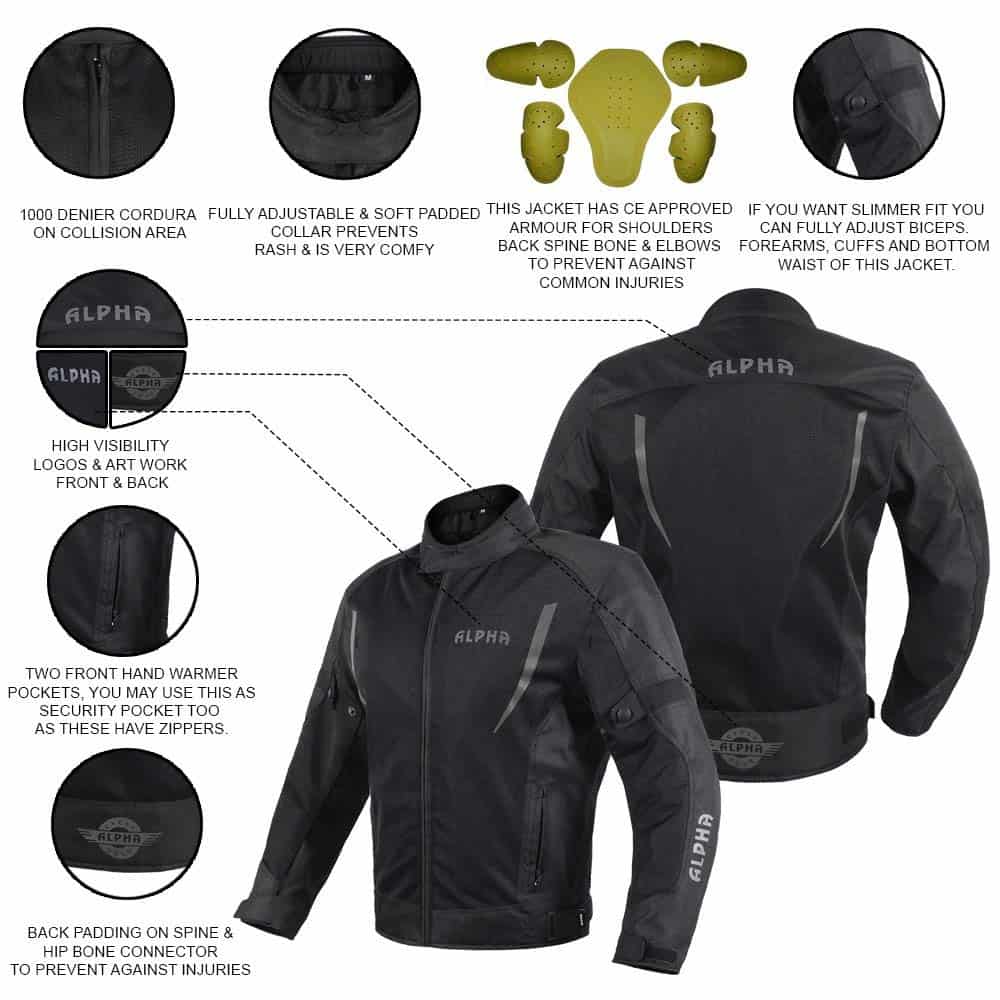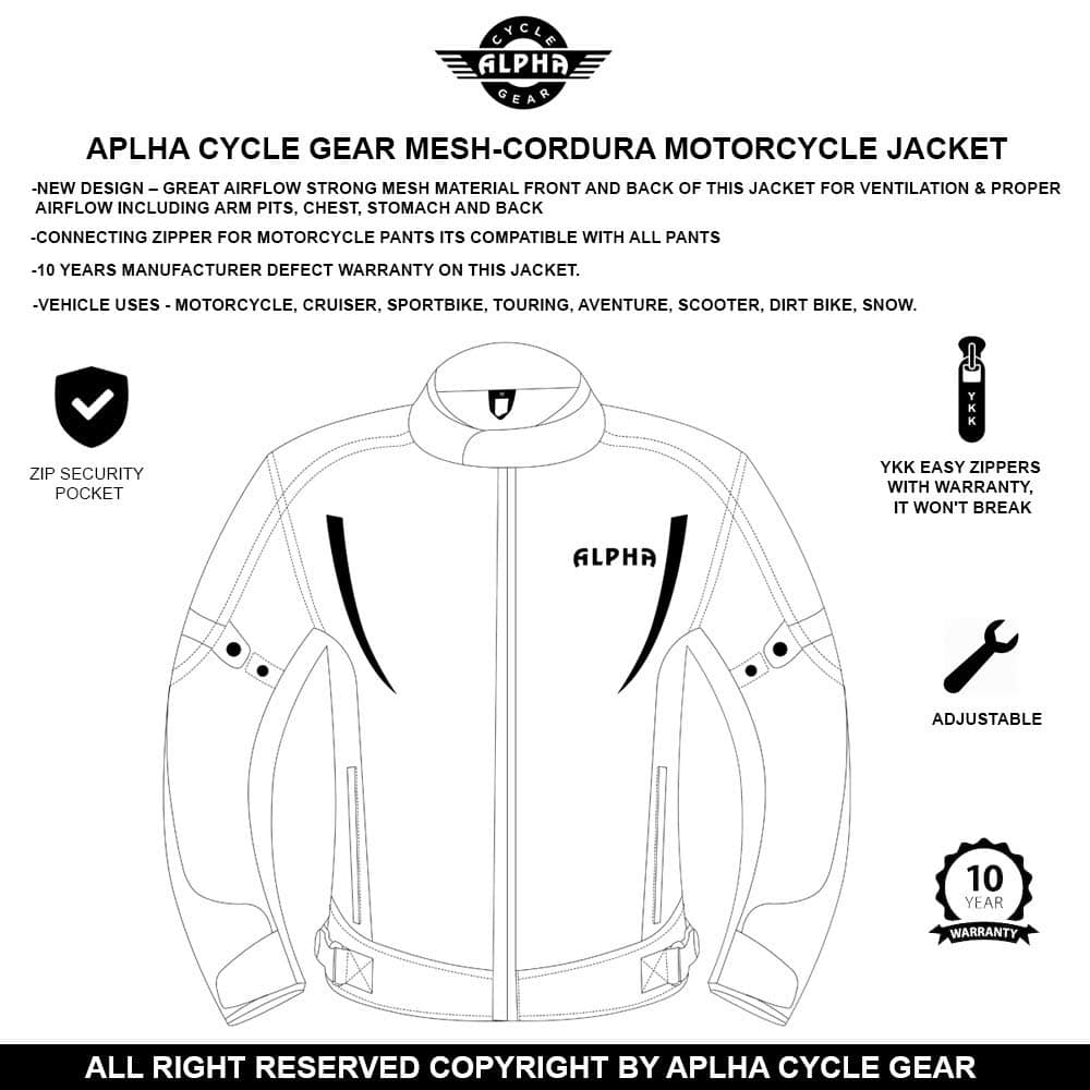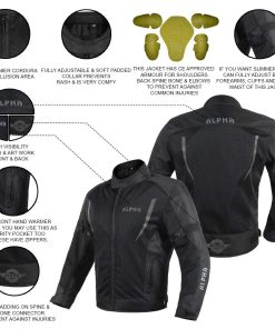 CARACTERÍSTICAS: CHAQUETA DE MONTAR DE GARANTÍA DE POR VIDA 5 ARMADURAS APROBADAS POR CE 2 HOMBROS, 2 CODOS, 1 ESPALDA TAMBIÉN EXTRAÍBLES EN ESTA CHAQUETA DE MOTO CON ALTA VISIBILIDAD TOTALMENTE AJUSTABLE EN 10 PUNTOS. OBTÉN ESE AJUSTE PERSONALIZADO EN ESTA INCREÍBLE CHAQUETA BLINDADA. EXTERIOR DE MALLA PARA EL MEJOR FLUJO DE AIRE FRONTAL / TRASERO EN ESTA CHAQUETA DE MOTOCICLISTA PARA HOMBRES. SISTEMA DE FLUJO DE AIRE, NO MÁS OLORES DE AXILA CHAQUETA DIRT BIKE PARA HOMBRES CON LOGOS REFLECTANTES DE ALTA VISIBILIDAD AL FRENTE, ESPALDA Y BRAZOS. CUELLO DE ESPUMA DE MEMORIA PARA COMODIDAD EN ESTAS CHAQUETAS DE MOTOCICLETA PARA HOMBRES. LA CHAQUETA DE MALLA ALPHA TIENE PROTECCIÓN SEMI 2 CAPAS DE ESPUMA ACOLCHADA EN LA PARTE INFERIOR DE LA ESPALDA CHAQUETA DEPORTIVA ALPHA TIENE CONSTRUCCIÓN EXTERNA TELA DE CORDURA 1000 D EN ÁREAS DE COLISIÓN 600 D EN ÁREAS REGULARES ESTA CHAQUETA DE MOTOCICLISMO DUAL TIENE CREMALLERA DE CONEXIÓN PARA LOS PANTALONES DE MOTOCICLETA COMPATIBLE CON TODOS LOS PANTALONES DE MOTOCICLETA. INCREÍBLEMENTE, ESTA CHAQUETA DE MOTO PARA HOMBRES CON ARMADURA VIENE CON BOLSILLO OCULTO PARA TELÉFONO BOLSILLO PARA PORTAINCÓGNITA CHAQUETA DE MOTOCICLISTA. BOLSILLO CALENTADOR DE MANOS CHAQUETA MOTO HOMBRES CREMALLERAS YKK GARANTÍA DE POR VIDA CHAQUETA DE TOURING.