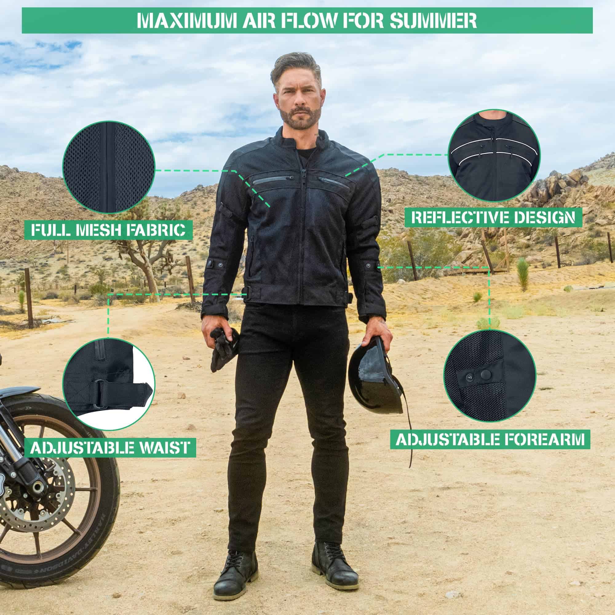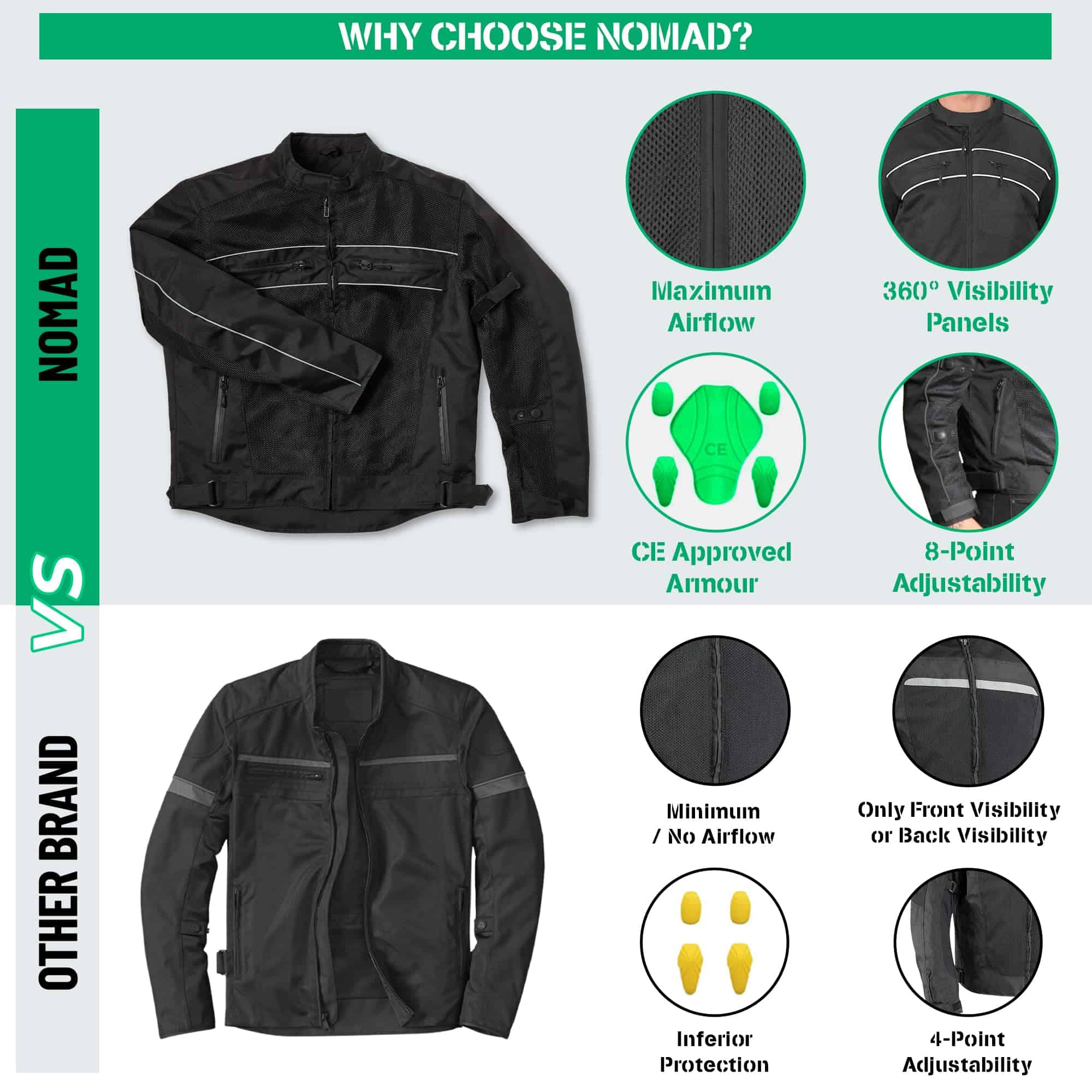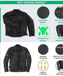 La chaqueta de motocicleta de malla Nomad de verano para hombres es perfecta para una amplia gama de estilos de conducción. Ya sea que estés acampando, participando en rallys de motocicletas, realizando largas travesías o simplemente navegando por la acción urbana diaria, esta chaqueta de moto de verano es la elección ideal. Esta chaqueta de moto de malla para hombres cuenta con un exterior resistente de Cordura con un alto índice de denier, lo que hace que la chaqueta de moto de malla para hombres sea adecuada para las duras condiciones de la carretera. A pesar de su diseño ligero, esta chaqueta de moto de aventura para mujeres y hombres se siente a prueba de balas debido a su alto índice de denier. La malla textil y los conductos frontales en esta chaqueta de moto blindada para mujeres la hacen ideal para la conducción de motocicletas en verano. El flujo de aire máximo proporcionado por la chaqueta de moto fresca de malla para hombres con conductos. A diferencia de las chaquetas de motocicleta de otras marcas o chaquetas Harley para hombres, chaquetas de moto impermeables, chaquetas de ciclismo para hombres, chaqueta honda y chaquetas de carreras, nuestras chaquetas de moto transpirables para hombres ofrecen el doble de ventilación. Esta chaqueta de moto para hombres está disponible en chaquetas negras, chaquetas rojas, chaquetas verdes, chaquetas naranjas, chaquetas azules y chaquetas grises. La seguridad es importante al seleccionar la mejor chaqueta de moto para hombres. Esta chaqueta de moto para hombres viene con un acolchado de armadura CE certificado para la columna vertebral, hombros y codos. Si bien es fácil encontrar acolchado para codos y hombros en chaquetas de moto blindadas de nivel 2 CE, el acolchado para la columna vertebral es una característica exclusiva de nuestra chaqueta de moto para hombres con armadura. Por lo tanto, puedes confiar en esta chaqueta de moto blindada para hombres para protegerte. Las rayas reflectantes en las chaquetas de alta visibilidad para hombres son cruciales. Nuestra chaqueta de alta visibilidad para hombres viene con elementos reflectantes en la parte delantera y trasera con chaquetas de seguridad para hombres y mujeres para motocicletas. Estas características mejoran significativamente la calificación de seguridad de nuestra chaqueta de motociclista negra. Solo se puede disfrutar del paseo en moto si la ropa de moto para hombres es cómoda. La chaqueta de moto de malla para hombres redefine la comodidad de conducción con su ajustabilidad de 8 puntos, a diferencia de una chaqueta de moto de conducción ajustable regular para hombres con solo 4 puntos. Las correas en la cintura de la chaqueta de malla para hombres, puños y codos te permiten adaptar la chaqueta de moto para hombres a tu estilo de conducción. La postura de conducción de una chaqueta cruiser, chaqueta sportbike, chaqueta de moto de aventura, chaqueta de motocross, chaqueta de enduro, chaqueta de moto de doble deporte o chaqueta de ciclismo para hombres es bastante diferente. Las correas ajustables en la chaqueta de moto para hombres en verano ofrecen libertad de movimiento. La chaqueta de moto con bolsillos con cierre es una característica exclusiva de la chaqueta de moto para hombres. Un bolsillo interno único, dos bolsillos superiores externos y dos bolsillos laterales, chaqueta de alta visibilidad para hombres reducen la necesidad de bolsas de manillar. Puedes guardar tus gafas de sol, artículos pequeños, teléfono y billetera en estos bolsillos de chaqueta de moto.