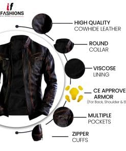 Fabricada con cuero de alta calidad y resistente, esta chaqueta de moto armadurada es fuerte y suave, proporcionando una sensación cómoda y duradera con un aspecto naturalmente desgastado. Diseñada tanto para estilo como para seguridad, presenta protección de Armadura CE en los hombros, codos y espalda para una excelente protección sin perder comodidad. La chaqueta de moto de verano tiene un diseño práctico y elegante, que incluye un cierre frontal con cremallera, múltiples bolsillos para almacenamiento, un cuello con cierre de botón a presión, rayas doradas llamativas en las mangas y puños ajustables con cremallera para un ajuste perfecto. El suave forro interior añade calidez y confort, convirtiéndola en una excelente elección para cualquier ocasión. Ya sea que estés conduciendo tu moto o saliendo informalmente, esta chaqueta de cuero para moto combina la funcionalidad motociclista con la moda cotidiana. Con un ajuste relajado pero elegante, permite un fácil movimiento manteniendo un aspecto masculino y nítido.
