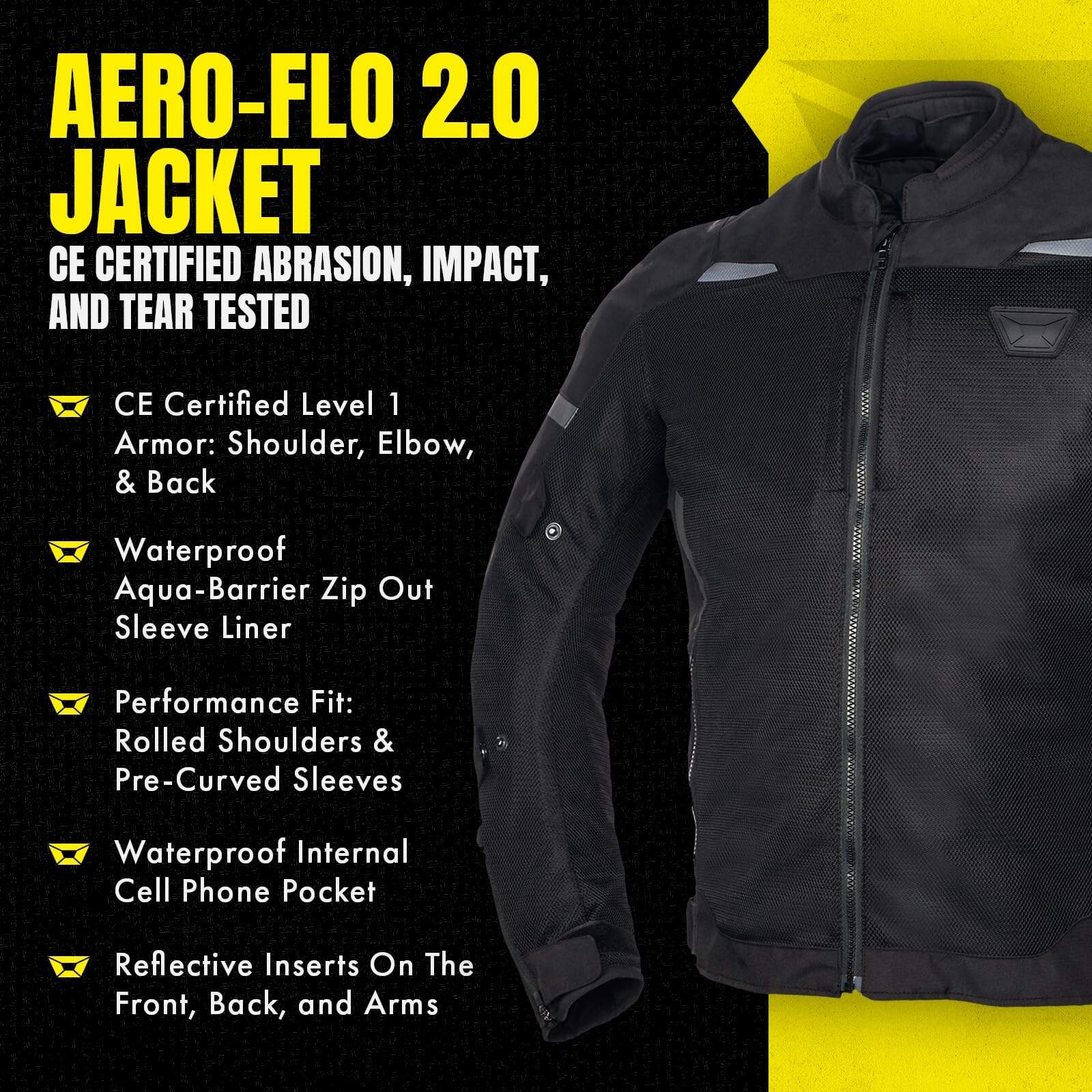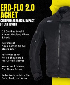 Gear up for adventure with this upgraded riding jacket, the Aero-Flo 2.0, blending superior protection, comfort, and sleek style for every journey on the road. Armanox Armor: CE Level 1 armor included in the shoulders, elbows, and back add extra impact protection and abrasion resistance, tested and CE certified to EN 1621.1. Abrasion, impact and tear tested, and CE certified A EN 17092-2. Comfort: Durable, free flowing, 600 denier polyester and 600 denier poly mesh chassis. Performance-fit, rolled shoulders and pre-curved, rotated sleeves. 4-Way stretch at shoulders and elbows. Personal Fit: Hook and loop waist adjusters and hidden arm snaps ensure this jacket fits motorcycle riders of all sizes. Featuring: Aqua-Barrier waterproof/breathable zip out full sleeve liner. Waterproof internal cell phone pocket. Durable YKK brand zippers. Zippered hand and chest pockets. Reflective inserts on front, back and arms
