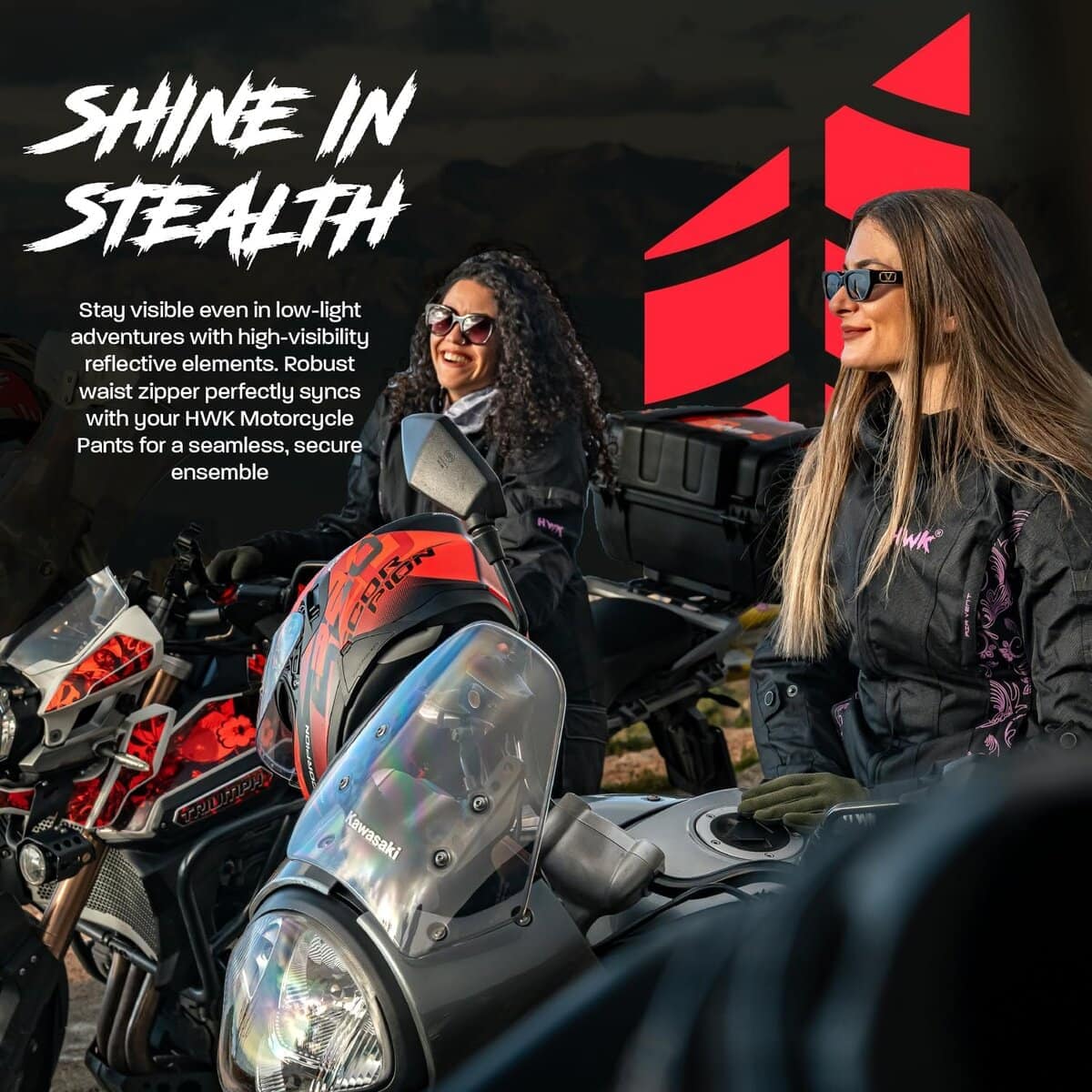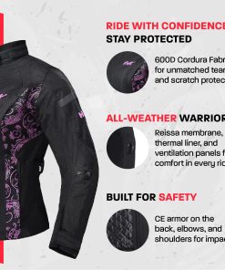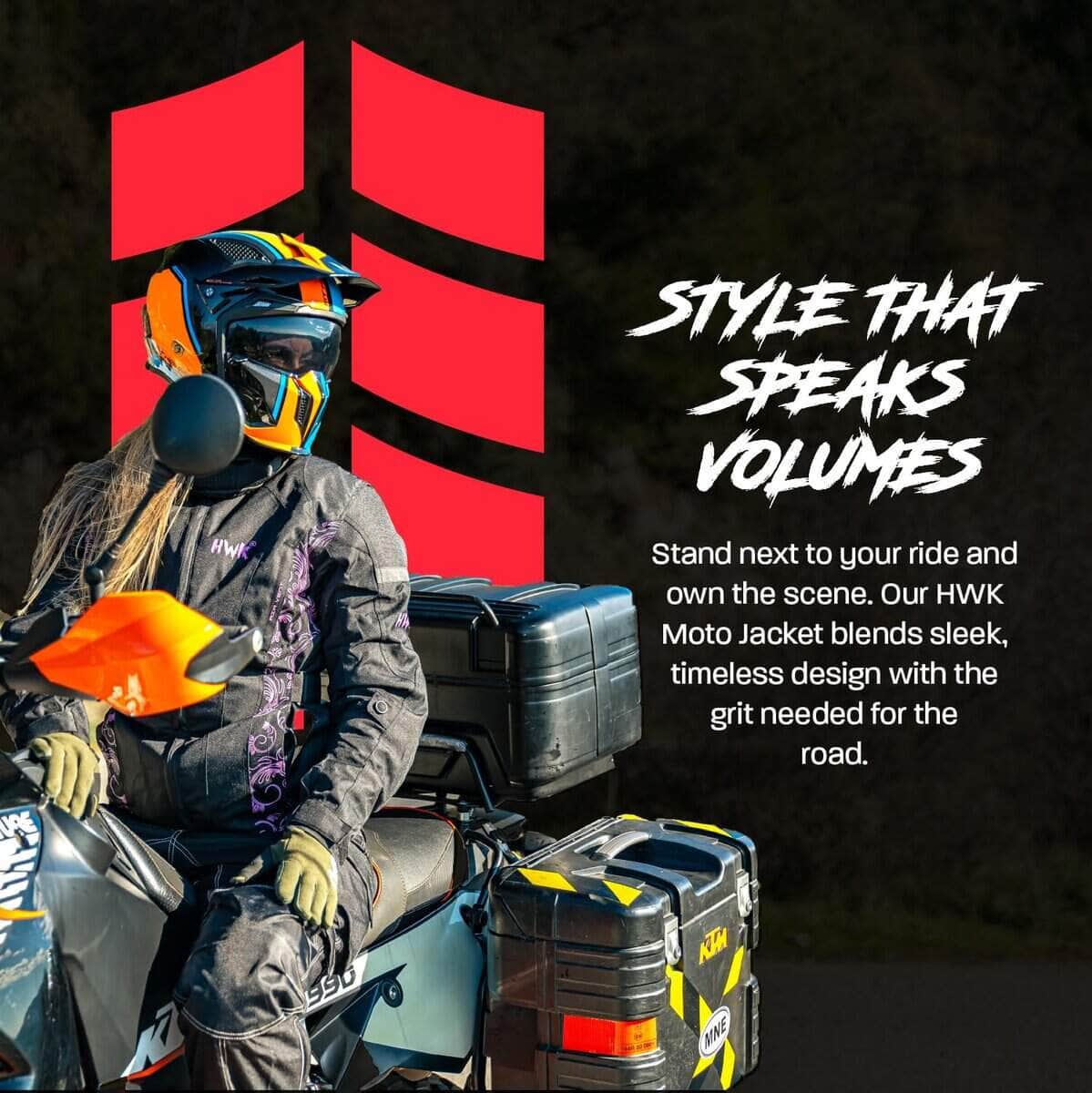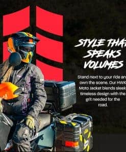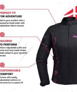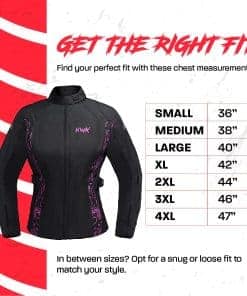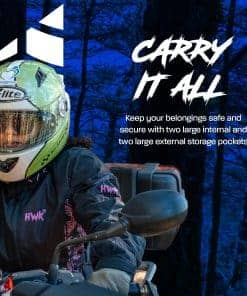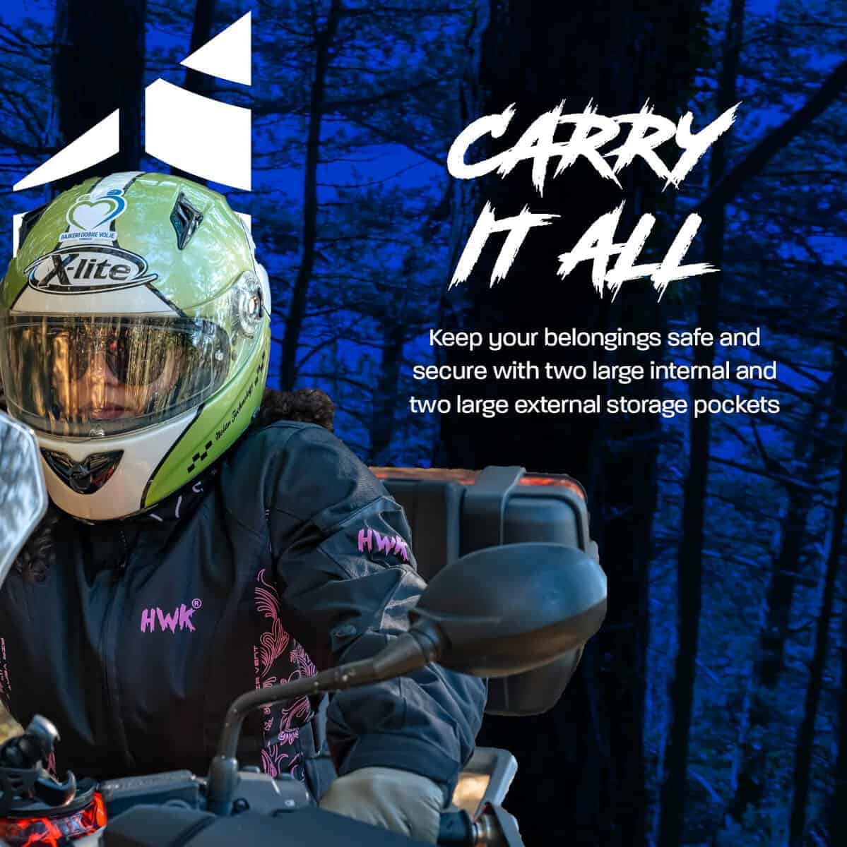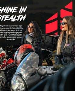 HWK es una marca establecida por motociclistas para motociclistas. Vivimos en un país con muchos extremos climáticos, donde puedes encontrar las cuatro estaciones. Aquí es donde creció el equipo de HWK, por lo que entendemos las características y funciones requeridas para una chaqueta de moto touring para mujeres de todas las estaciones que sea resistente al viento y al agua. Nuestra chaqueta de moto para mujeres tiene un exterior de tejido de poliéster 600D Cordura, membrana Reissa transpirable y forro térmico aislante desmontable. La armadura CE en la espalda, codos y hombros proporciona protección adicional, mientras que cinco paneles de ventilación de aire mantienen la chaqueta fresca en climas cálidos. Esta chaqueta de moto textil para mujeres cuenta con logotipos reflectantes HWK de alta visibilidad y elementos de diseño de colores que te mantienen visible en condiciones de poca luz. Esta chaqueta de motociclista para mujeres está cortada para ajustarse, presenta un cuello forrado de neopreno con cierre de velcro ajustable, además de botones fácilmente ajustables a lo largo de los brazos, puños ajustables con velcro y correas de gancho y lazo en la cintura. Mantén tus pertenencias seguras con dos bolsillos internos grandes y dos bolsillos de almacenamiento externos grandes. Conecta de forma segura tu Chaqueta de Moto HWK a tu Pantalón de Moto HWK usando una resistente cremallera de conexión en la cintura. Elige tu talla de chaqueta de mujer en base a la medida de tu pecho, desde S – 36 hasta 4XL – 47 . Entre tallas, elige la más pequeña para un ajuste ceñido o la más grande para un ajuste suelto. MÁXIMA CALIDAD al MÍNIMO PRECIO. Nuestra chaqueta de moto para mujeres es una ganga. Apostamos a que no puedes encontrar una chaqueta de moto con armadura a este precio en el mercado de accesorios y ropa protectora de motocicleta. Síguenos en Instagram y Facebook para ser parte de nuestro creciente grupo de ENAMORADOS DE LA AVENTURA!