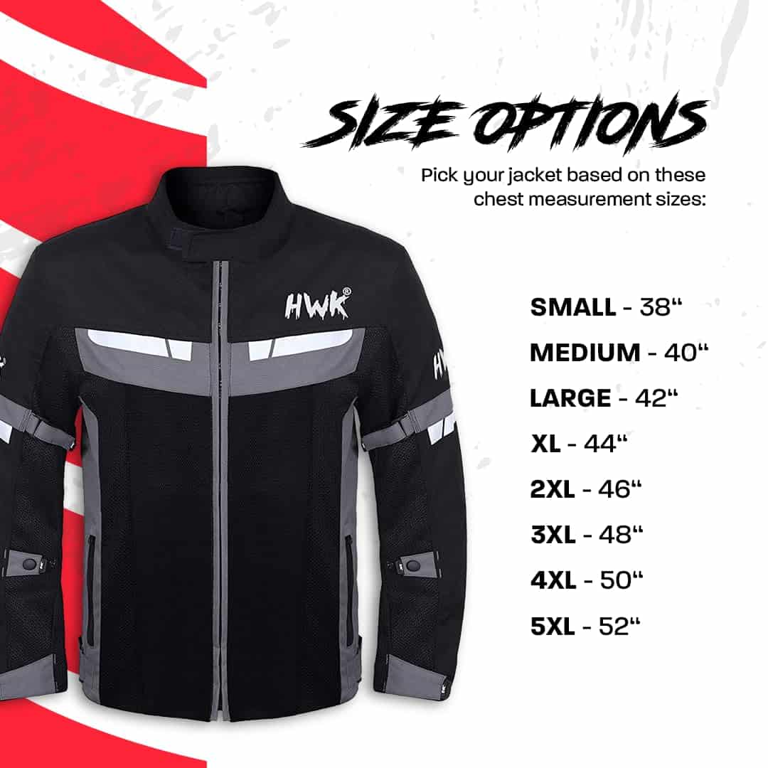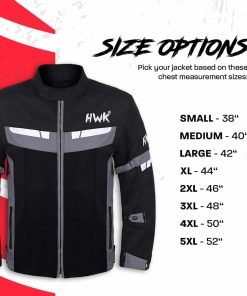 5. Ajuste Perfecto. Nuestra Chaqueta de Moto HWK viene en varias tallas de medida de pecho, desde S – 38 hasta 5XL – 52. Entre tallas Escoja la más grande para un ajuste más holgado o la más pequeña para un ajuste más ceñido
