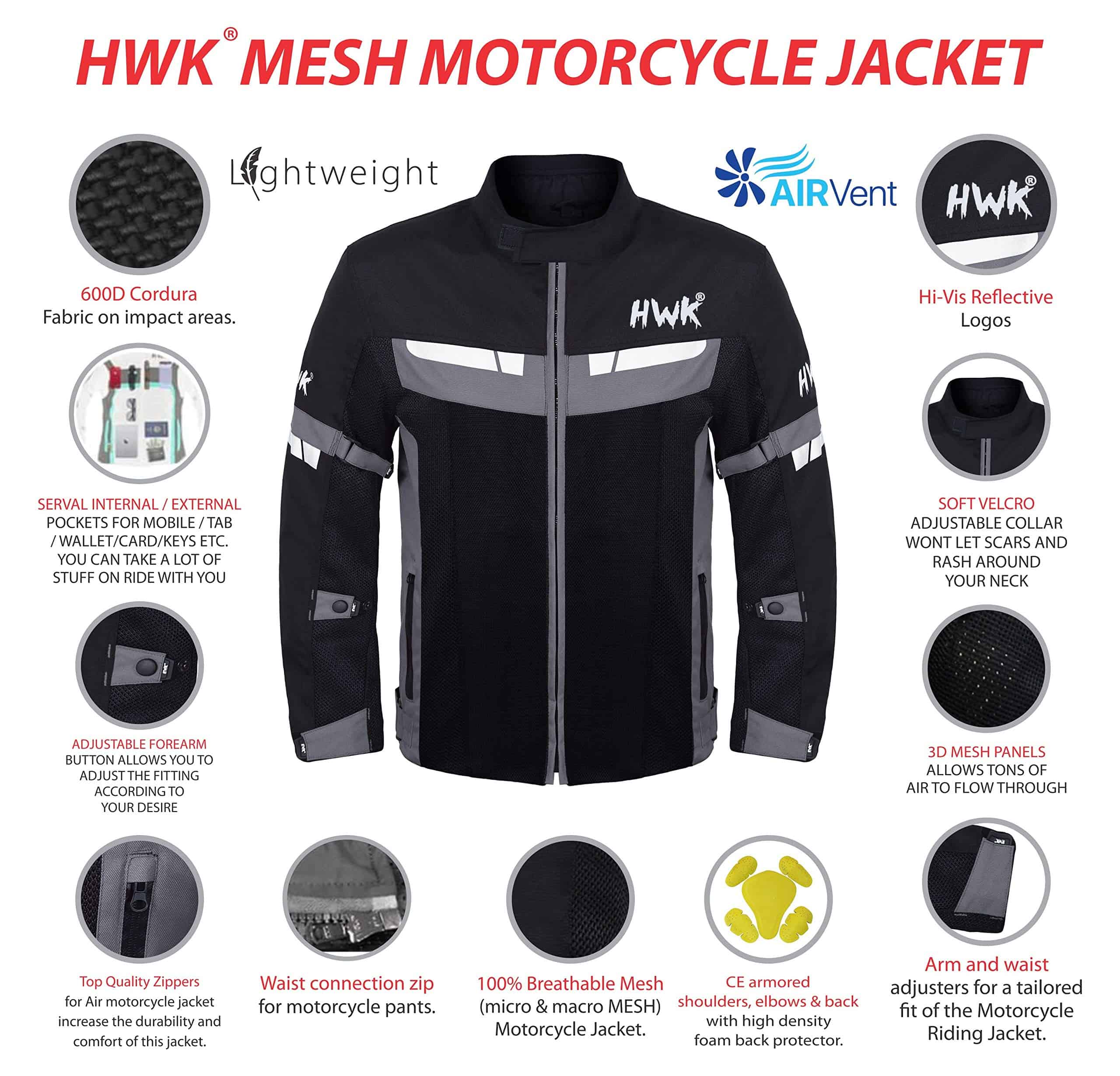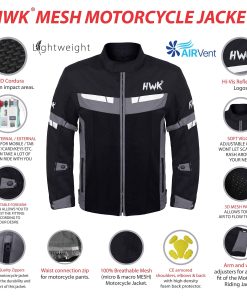 HWK es una marca consolidada por motoristas para motoristas. Vivimos en un país con muchos extremos climáticos, donde puedes encontrarte con las cuatro estaciones. Aquí es donde creció el equipo de HWK, por lo que entendemos las características y funciones necesarias para una chaqueta de moto que te mantenga fresco en el calor del verano. Nuestra Chaqueta de Moto de Malla HWK para Hombres y Mujeres es resistente y fuerte, pero suave y cómoda. Está hecha de paneles de malla 3D macro y micro 100% transpirables que permiten una conducción cómoda y fresca en clima cálido. Los paneles de ventilación de aire de adelante hacia atrás permiten que el aire fluya libremente a través de la chaqueta de moto de malla. Ajuste su cuello suave de la chaqueta con un práctico cierre de velcro. Los ajustadores de brazo, puño, codo y cintura le permiten personalizar fácilmente el ajuste de su chaqueta de carreras. Combina tu Chaqueta de Moto HWK con tus Pantalones de Moto HWK para una conexión perfecta. Conduzca de forma segura con armadura CE en codos, hombros y espalda, tela 600D Cordura en áreas de alto impacto y acolchado de espuma de alta densidad en la parte posterior de su chaqueta de moto de verano. Mantenga sus objetos de valor seguros con bolsillos de almacenamiento grandes exteriores e interiores. Logotipos de alta visibilidad de HWK y elementos reflectantes en el pecho y los brazos de su chaqueta de moto para hombres y mujeres le mantienen visible en la oscuridad. Consiga su equipamiento de moto en azul, verde o rojo para una mayor visibilidad. Elija su chaqueta de moto de malla basada en esta guía de tallas (pulgadas) de medida de pecho: S – 38, M – 40, L – 42, XL – 44, 2XL – 46, 3XL – 48, 4XL – 50 o 5XL – 52. Si está entre tallas, elija la más grande para un ajuste relajado o la más pequeña para un ajuste ajustado. CALIDAD MÁXIMA al PRECIO MÍNIMO. Apostamos a que no pueden encontrar accesorios de moto para hombres y mujeres a este precio en el mercado de equipamiento de moto de protección para hombres y mujeres. HWK para formar parte de nuestro creciente grupo de ENTUSIASTAS DE MOTO!