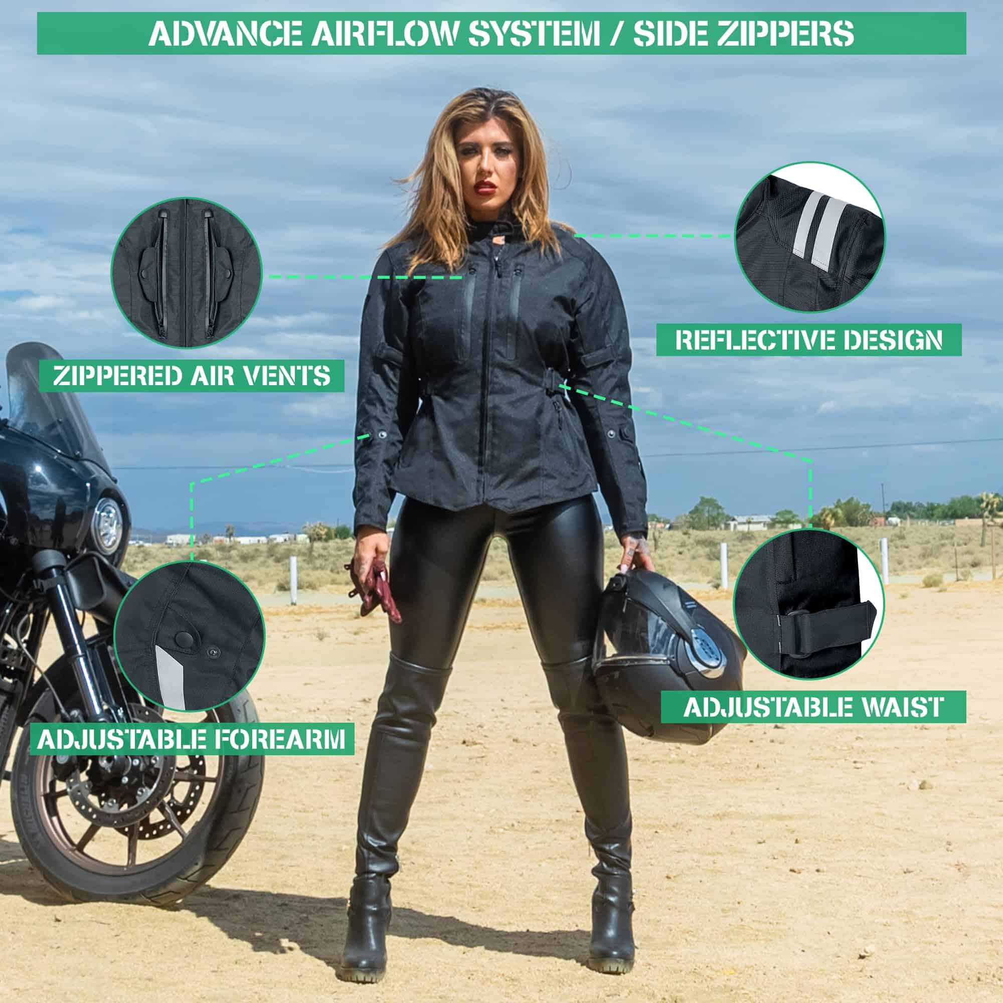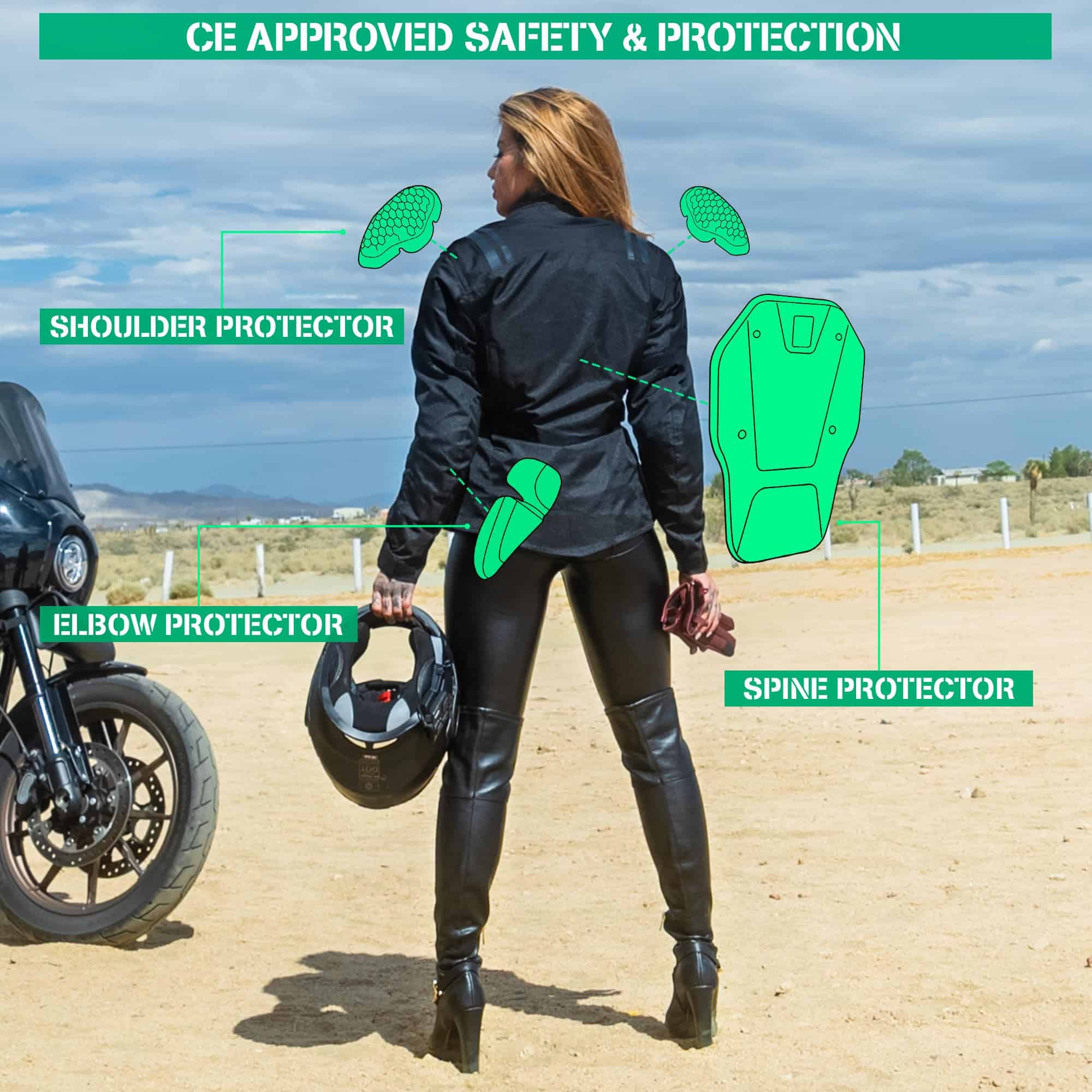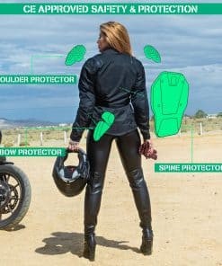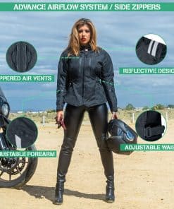 La chaqueta de moto para mujeres está hecha de tejido Cordura recubierto de poliuretano de 600D que permite que esta chaqueta de motociclista para mujeres sea capaz de enfrentarse a terrenos difíciles, condiciones climáticas adversas y las demandas de la carretera abierta. Ya sea que conduzcas una motocicleta de turismo y emprendas viajes de camping, uses una chaqueta de moto para mujeres cruiser, chaqueta de moto de aventura con armadura para mujeres, chaqueta de motonieve para mujeres, chaquetas duales para mujeres, chaqueta de moto de enduro o chaqueta de caza para mujeres para aventuras todoterreno, o conduzcas una cruiser, una cafe racer o una moto de calle estándar para paseos urbanos, el diseño elegante en color negro de esta chaqueta de motociclista de Cordura altamente funcional para mujeres la convierten en un básico en tu guardarropa de motociclismo. Esta chaqueta de moto para mujeres de todo clima resultará ser tu equipo definitivo para la aventura en motocicleta, ya que funciona igual de bien en climas cálidos y fríos chaqueta de motociclista de 4 temporadas para mujeres, gracias a sus ventilaciones con cremallera y forro interno. El recubrimiento de poliuretano de esta chaqueta de moto para mujeres te permite viajar cómodamente bajo la lluvia intensa, esta chaqueta de motocicleta de clima frío para mujeres es bastante duradera y no deja que se filtre el agua. El recubrimiento impermeable no afecta la transpirabilidad de esta chaqueta de moto transpirable para mujeres de moda. Las ventilaciones con cremallera en la parte delantera de esta chaqueta de moto ligera para mujeres aseguran una ventilación óptima al montar en clima cálido, chaqueta de moto de verano para damas. Estas ventilaciones con cremallera son fáciles de abrir y cerrar mientras conduces tu moto, lo que te permite ajustar el flujo de aire dentro de la chaqueta de motociclista para mujeres.La chaqueta de motocicleta ajustable para mujeres viene con correas de velcro ajustables en las mangas y la cintura. Esta característica resulta bastante útil al llevar una capa adicional debajo de la chaqueta de moto de invierno para mujeres. No necesitas detener tu moto para ajustar tu chaqueta de moto negra para mujeres. Esta chaqueta de motocicleta blindada para mujeres viene con acolchado protector aprobado por CE en los hombros, codos y espalda. La protección trasera de la chaqueta de seguridad para mujeres está ausente en las chaquetas de moto para mujeres a este precio. la chaqueta de carreras para mujeres es extremadamente confiable en la reducción de impactos, ofreciendo máxima protección. El ribete reflectante de 360 grados en la chaqueta reflectante para mujeres mejora enormemente su calificación de seguridad con chaquetas protectoras encendidas.Todas las características de esta chaqueta de moto para mujeres de moda están diseñadas con precisión. Las chaquetas de carga para mujeres tienen bolsillos con cremallera en los lugares adecuados. Esta chaqueta de moto de invierno para mujeres resulta útil en el frío. Todos los bolsillos cuentan con cremalleras resistentes al agua que los hacen impermeables para la chaqueta de moto de las mujeres. Con esta chaqueta de moto para niñas puesta, nunca tendrás que preocuparte por tu teléfono o cartera. Esta chaqueta de moto lavable a máquina para mujeres es fácil de limpiar y ofrece un buen valor por el dinero, ya que mantiene su forma y tamaño, chaquetas pequeñas y grandes para mujeres.
